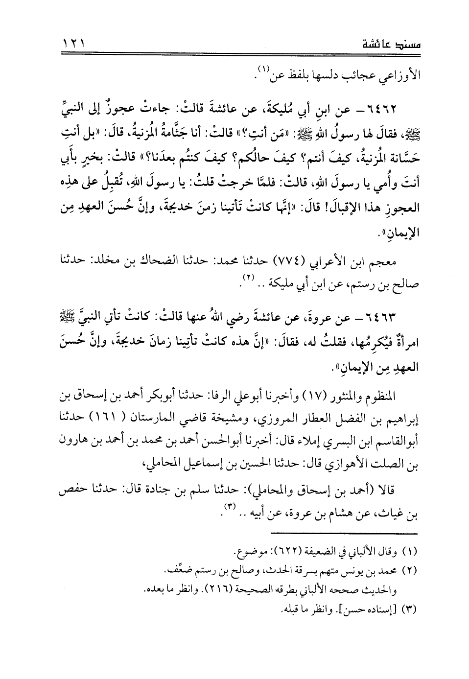 6462 - عن ابنِ أبي مُليكةَ، عن عائشةَ قالتْ: جاءتْ عجوزٌ إلى النبيِّ صلى الله عليه وسلم، فقالَ لها رسولُ اللهِ صلى الله عليه وسلم: «مَن أنتِ؟» قالتْ: أنا جَثَّامةُ المُزنيةُ، قالَ: «بل أنتِ حَسَّانة المُزنيةُ، كيفَ أنتم؟ كيفَ حالُكم؟ كيفَ كنتُم بعدَنا؟» قالتْ: بخيرٍ بأَبي أنتَ وأُمي يا رسولَ اللهِ، قالتْ: فلمَّا خرجتْ قلتُ: يا رسولَ اللهِ، تُقبِلُ على هذِه العجوزِ هذا الإقبالَ! قالَ: «إنَّها كانتْ تَأتينا زمنَ خديجةَ، وإنَّ حُسنَ العهدِ مِن الإيمانِ».