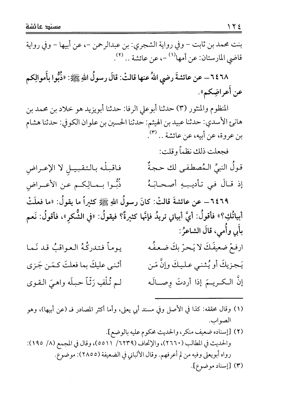 المنظوم والمنثور (3) حدثنا أبوعلي الرفا: حدثنا أبويزيد هو خلاد بن محمد بن هانئ الأسدي: حدثنا عبيد بن الهيثم: حدثنا الحسين بن علوان الكوفي: حدثنا هشام بن عروة، عن أبيه، عن عائشة .. (¬3).