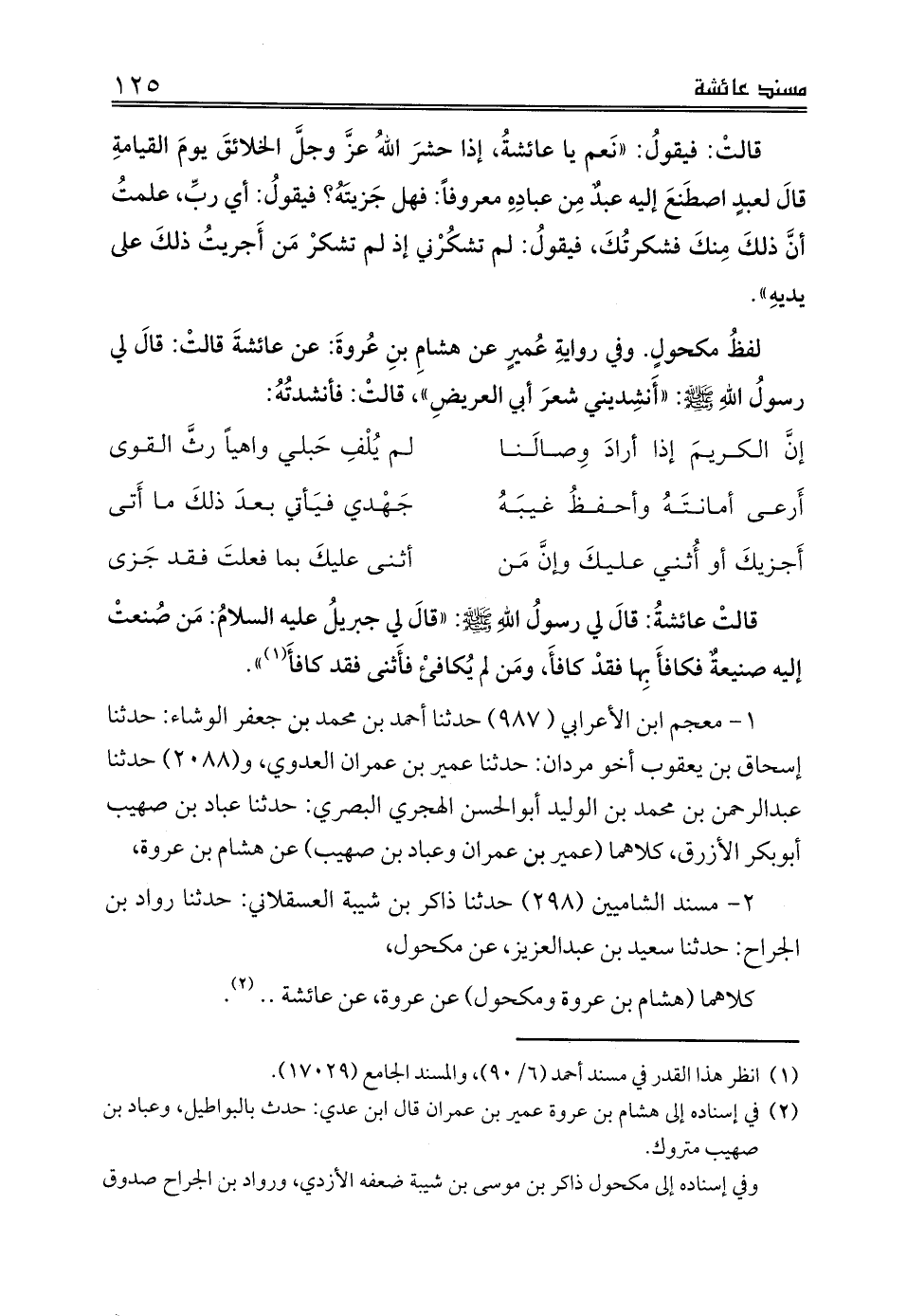 لفظُ مكحولٍ. وفي روايةِ عُميرٍ عن هشامِ بنِ عُروةَ: عن عائشةَ قالتْ: قالَ لي رسولُ اللهِ صلى الله عليه وسلم: «أَنشِديني شعرَ أبي العريضِ»، قالتْ: فأنشدتُهُ: