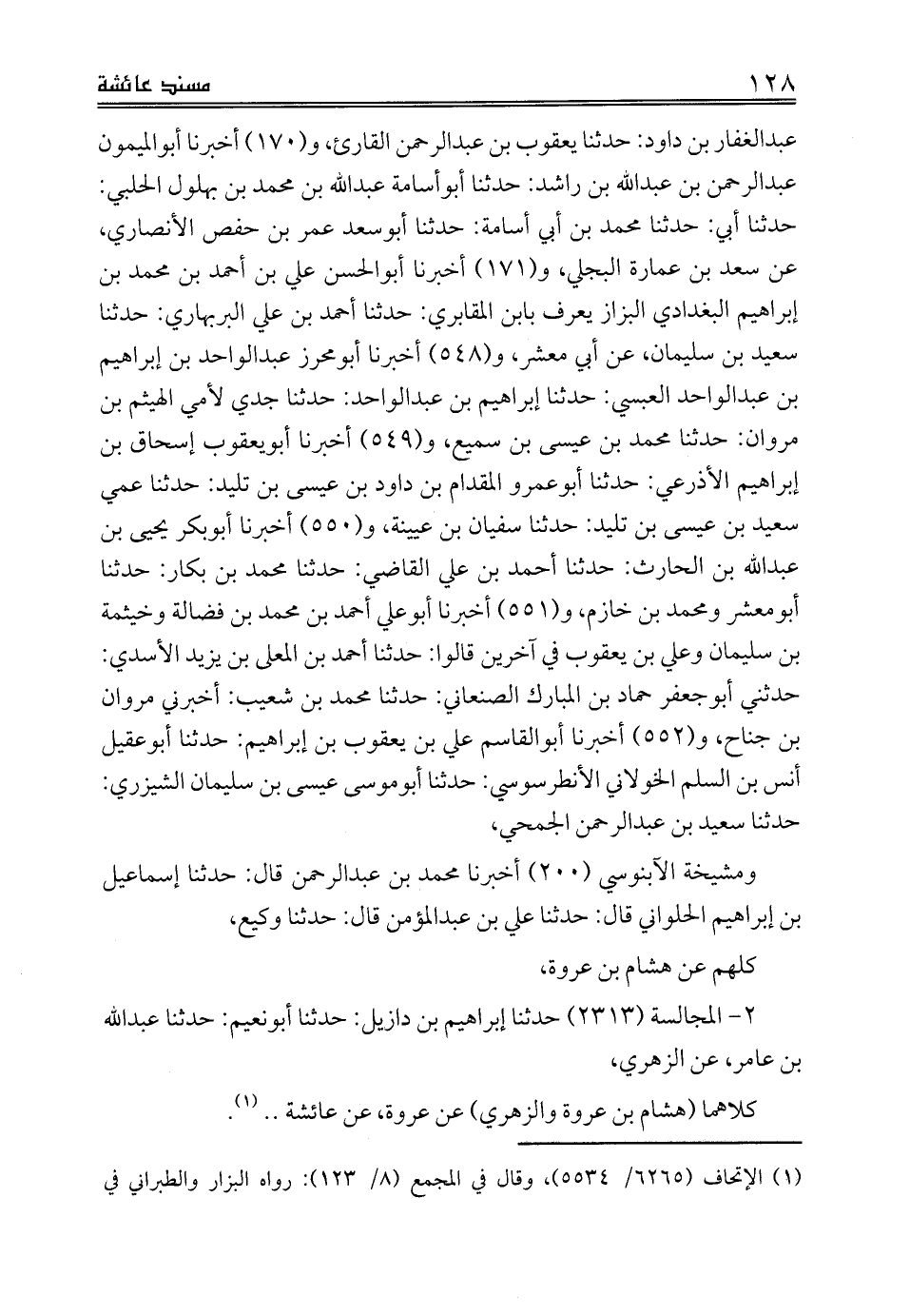عبدالغفار بن داود: حدثنا يعقوب بن عبدالرحمن القارئ، و (170) أخبرنا أبوالميمون عبدالرحمن بن عبدالله بن راشد: حدثنا أبوأسامة عبدالله بن محمد بن بهلول الحلبي: حدثنا أبي: حدثنا محمد بن أبي أسامة: حدثنا أبوسعد عمر بن حفص الأنصاري، عن سعد بن عمارة البجلي، و (171) أخبرنا أبوالحسن علي بن أحمد بن محمد بن إبراهيم البغدادي البزاز يعرف بابن المقابري: حدثنا أحمد بن علي البربهاري: حدثنا سعيد بن سليمان، عن أبي معشر، و (548) أخبرنا أبومحرز عبدالواحد بن إبراهيم بن عبدالواحد العبسي: حدثنا إبراهيم بن عبدالواحد: حدثنا جدي لأمي الهيثم بن مروان: حدثنا محمد بن عيسى بن سميع، و (549) أخبرنا أبويعقوب إسحاق بن إبراهيم الأذرعي: حدثنا أبوعمرو المقدام بن داود بن عيسى بن تليد: حدثنا عمي سعيد بن عيسى بن تليد: حدثنا سفيان بن عيينة، و (550) أخبرنا أبوبكر يحيى بن عبدالله بن الحارث: حدثنا أحمد بن علي القاضي: حدثنا محمد بن بكار: حدثنا أبومعشر ومحمد بن خازم، و (551) أخبرنا أبوعلي أحمد بن محمد بن فضالة وخيثمة بن سليمان وعلي بن يعقوب في آخرين قالوا: حدثنا أحمد بن المعلى بن يزيد الأسدي: حدثني أبوجعفر حماد بن المبارك الصنعاني: حدثنا محمد بن شعيب: أخبرني مروان بن جناح، و (552) أخبرنا أبوالقاسم علي بن يعقوب بن إبراهيم: حدثنا أبوعقيل أنس بن السلم الخولاني الأنطرسوسي: حدثنا أبوموسى عيسى بن سليمان الشيرزي: حدثنا سعيد بن عبدالرحمن الجمحي،