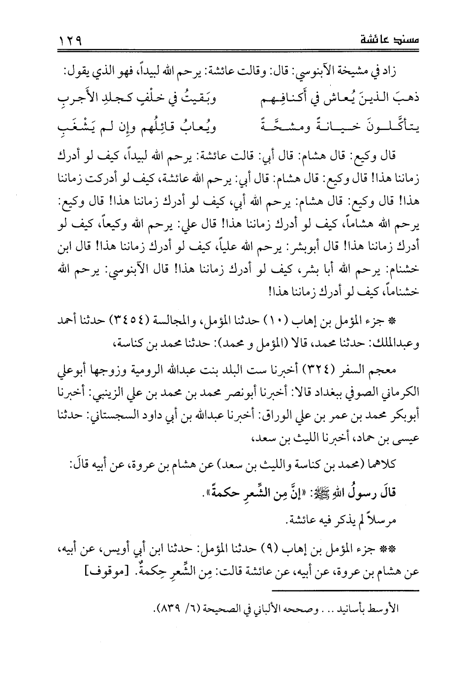 ** جزء المؤمل بن إهاب (9) حدثنا المؤمل: حدثنا ابن أبي أويس، عن أبيه، عن هشام بن عروة، عن أبيه، عن عائشة قالت: مِن الشِّعرِ حِكمةٌ. [موقوف]