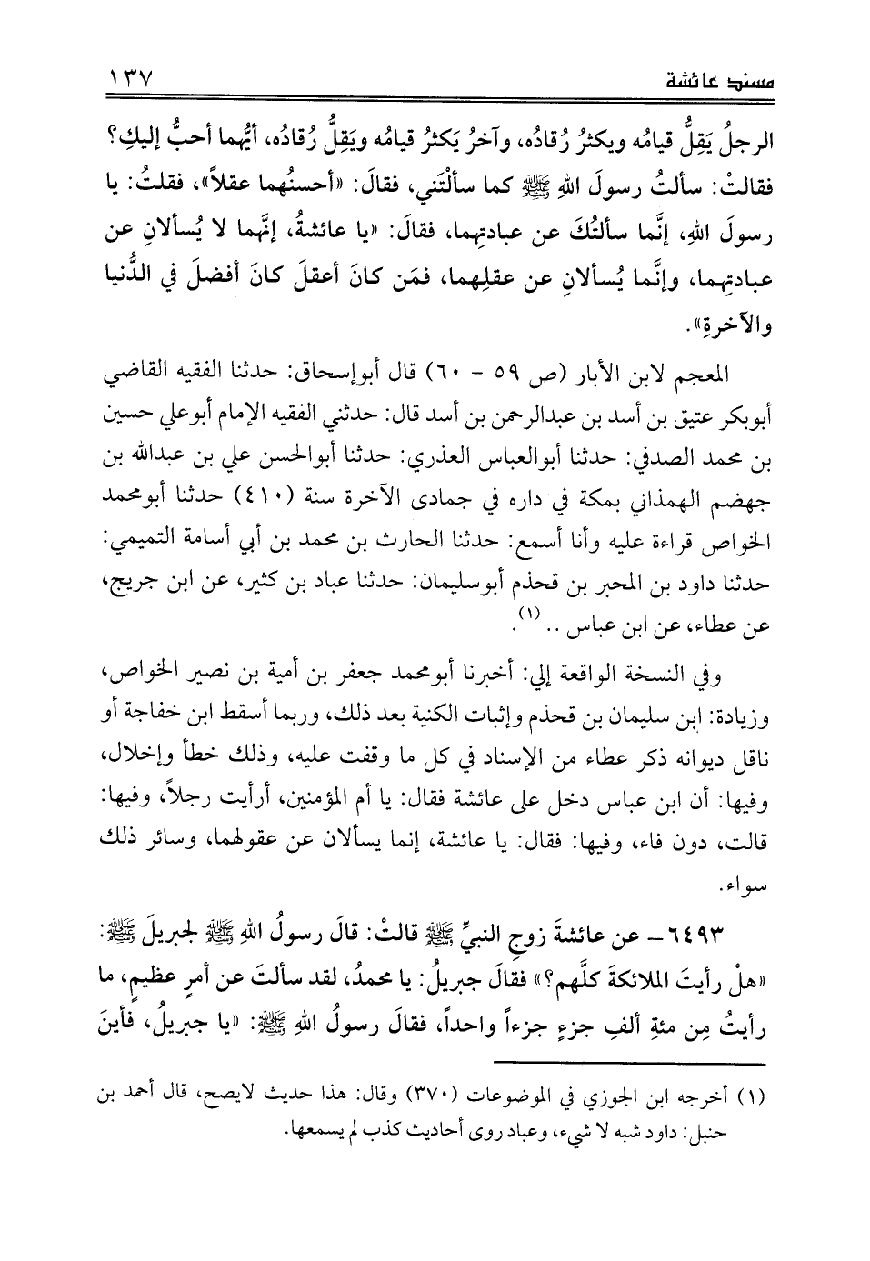 الرجلُ يَقِلُّ قيامُه ويكثرُ رُقادُه، وآخرُ يَكثرُ قيامُه ويَقِلُّ رُقادُه، أيُّهما أحبُّ إليكِ؟ فقالتْ: سألتُ رسولَ اللهِ صلى الله عليه وسلم كما سألْتَني، فقالَ: «أحسنُهما عقلاً»، فقلتُ: يا رسولَ اللهِ، إنَّما سألتُكَ عن عبادتِهما، فقالَ: «يا عائشةُ، إنَّهما لا يُسألانِ عن عبادتِهما، وإنَّما يُسألانِ عن عقلِهما، فمَن كانَ أعقلَ كانَ أفضلَ في الدُّنيا والآخرةِ».