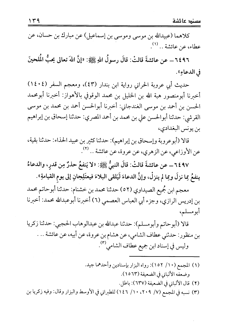 6496 - عن عائشةَ قالتْ: قالَ رسولُ اللهِ صلى الله عليه وسلم: «إنَّ اللهَ تعالى يحبُّ المُلحينَ في الدعاءِ».