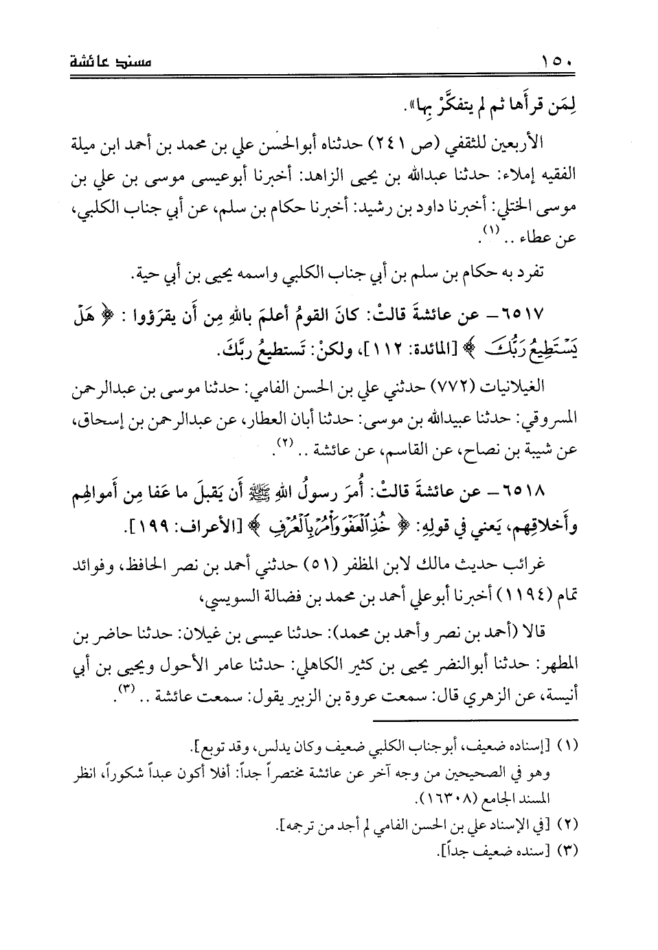 الغيلانيات (772) حدثني علي بن الحسن الفامي: حدثنا موسى بن عبدالرحمن المسروقي: حدثنا عبيدالله بن موسى: حدثنا أبان العطار، عن عبدالرحمن بن إسحاق، عن شيبة بن نصاح، عن القاسم، عن عائشة .. (¬2).