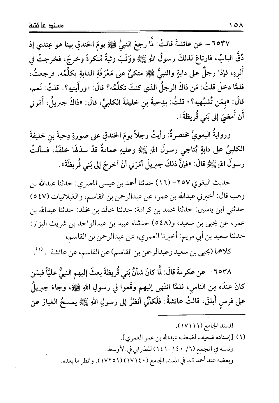 6537 - عن عائشةَ قالتْ: لمَّا رجعَ النبيُّ صلى الله عليه وسلم يومَ الخندقِ بينا هو عِندي إذ دُقَّ البابُ، فارتاعَ لذلكَ رسولُ اللهِ صلى الله عليه وسلم ووَثَبَ وثبةً مُنكرةً وخرجَ، فخرجتُ في أَثرِهِ، فإذا رجلٌ على دابةٍ والنبيُّ صلى الله عليه وسلم متكئٌ على مَعْرَفَةِ الدابةِ يكلِّمُه، فرجعتُ، فلمَّا دخلَ قلتُ: مَن ذاكَ الرجلُ الذي كنتَ تكلِّمُه؟ قالَ: «ورأَيتيهِ؟» قلتُ: نَعم، قالَ: «بِمَن تُشبِّهيه؟» قلتُ: بدِحيةَ بنِ خليفةَ الكلبيِّ، قالَ: «ذاكَ جبريلُ، أَمَرني أَن أَمضيَ إلى بَني قُريظةَ».