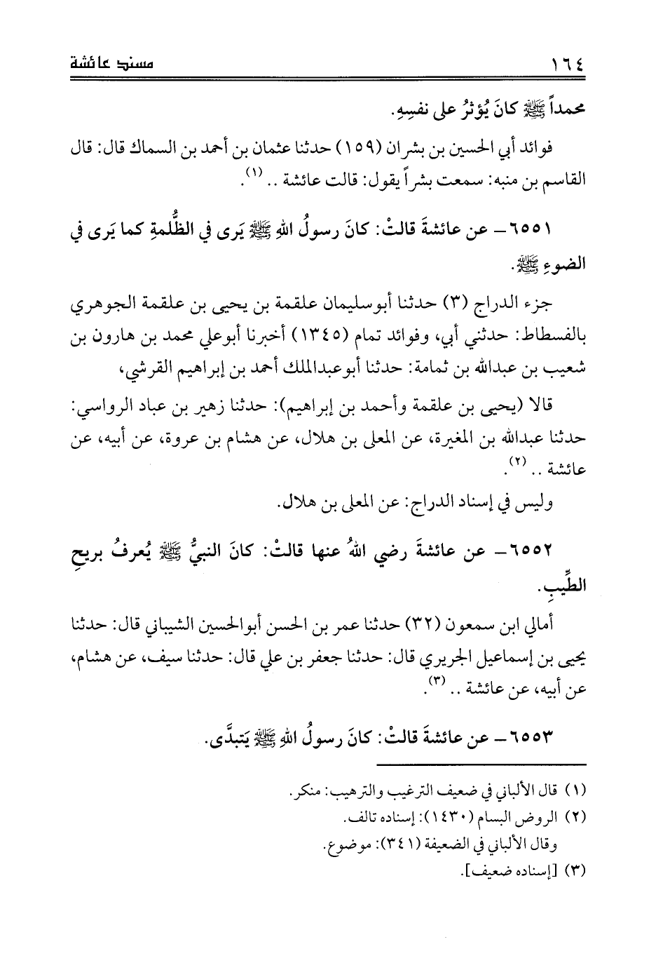 قالا (يحيى بن علقمة وأحمد بن إبراهيم): حدثنا زهير بن عباد الرواسي: حدثنا عبدالله بن المغيرة، عن المعلى بن هلال، عن هشام بن عروة، عن أبيه، عن عائشة .. (¬2).