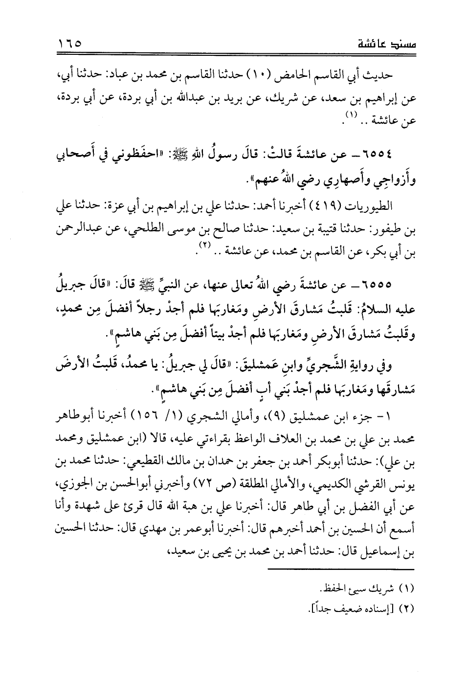 الطيوريات (419) أخبرنا أحمد: حدثنا علي بن إبراهيم بن أبي عزة: حدثنا علي بن طيفور: حدثنا قتيبة بن سعيد: حدثنا صالح بن موسى الطلحي، عن عبدالرحمن بن أبي بكر، عن القاسم بن محمد، عن عائشة .. (¬2).