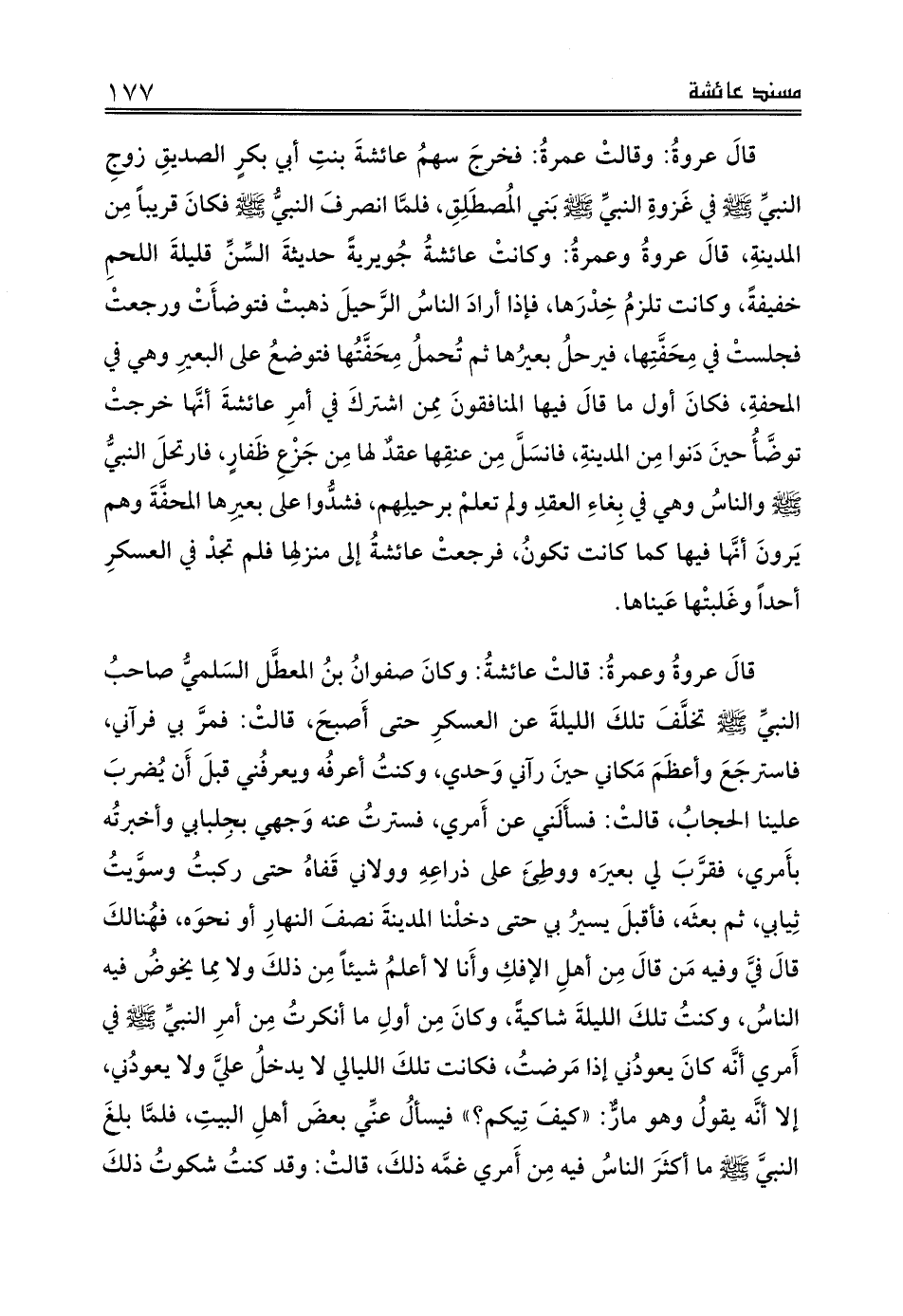 قالَ عروةُ: وقالتْ عمرةُ: فخرجَ سهمُ عائشةَ بنتِ أبي بكرٍ الصديقِ زوجِ النبيِّ صلى الله عليه وسلم في غَزوةِ النبيِّ صلى الله عليه وسلم بَني المُصطَلِقِ، فلمَّا انصرفَ النبيُّ صلى الله عليه وسلم فكانَ قريباً مِن المدينةِ، قالَ عروةُ وعمرةُ: وكانتْ عائشةُ جُويريةً حديثةَ السِّنِّ قليلةَ اللحمِ خفيفةً، وكانت تلزمُ خِدْرَها، فإذا أرادَ الناسُ الرَّحيلَ ذهبتْ فتوضأَتْ ورجعتْ فجلستْ في مِحَفَّتِها، فيرحلُ بعيرُها ثم تُحملُ مِحَفَّتُها فتوضعُ على البعيرِ وهي في المحفةِ، فكانَ أول ما قالَ فيها المنافقونَ مِمن اشتركَ في أمرِ عائشةَ أنَّها خرجتْ توضَّأُ حينَ دَنوا مِن المدينةِ، فانسَلَّ مِن عنقِها عقدٌ لها مِن جَزْعِ ظَفارٍ، فارتحلَ النبيُّ صلى الله عليه وسلم والناسُ وهي في بِغاءِ العقدِ ولم تعلمْ برحيلِهم، فشدُّوا على بعيرِها المحفَّةَ وهم يَرونَ أنَّها فيها كما كانت تكونُ، فرجعتْ عائشةُ إلى منزلِها فلم تجدْ في العسكرِ أحداً وغَلبتْها عَيناها.