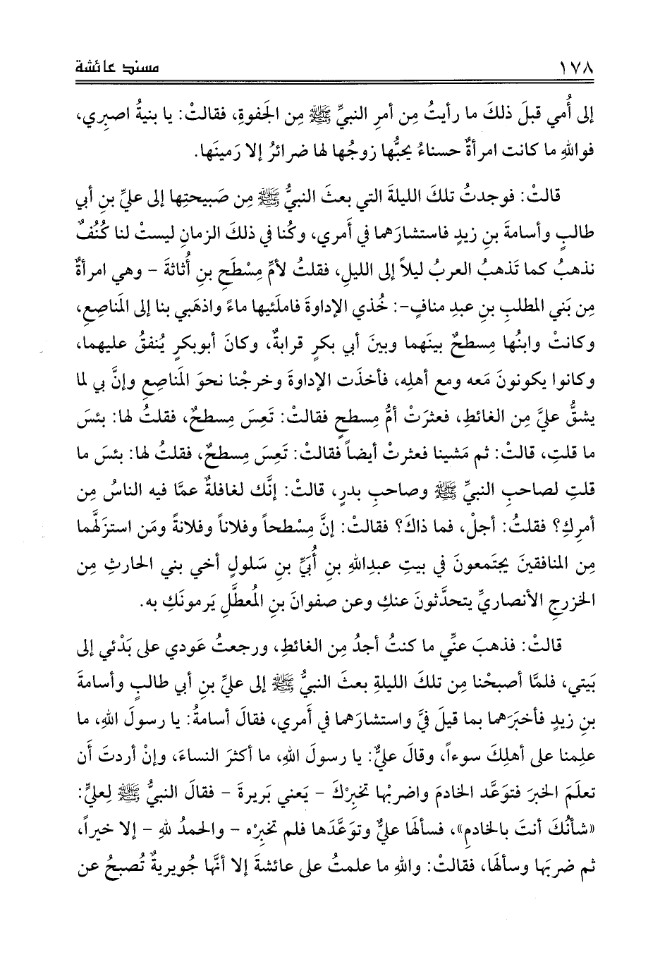 قالتْ: فوجدتُ تلكَ الليلةَ التي بعثَ النبيُّ صلى الله عليه وسلم مِن صَبيحتِها إلى عليِّ بنِ أبي طالبٍ وأسامةَ بنِ زيدٍ فاستشارَهما في أَمري، وكُنا في ذلكَ الزمانِ ليستْ لنا كُنُفٌ نذهبُ كما تَذهبُ العربُ ليلاً إلى الليلِ، فقلتُ لأمِّ مِسْطَحِ بنِ أُثاثةَ - وهي امرأةٌ مِن بَني المطلبِ بنِ عبدِ منافٍ-: خُذي الإداوةَ فاملَئيها ماءً واذهَبي بنا إلى المَناصِعِ، وكانتْ وابنُها مِسطحٌ بينَهما وبينَ أبي بكرٍ قرابةٌ، وكانَ أبوبكرٍ يُنفقُ عليهما، وكانوا يكونونَ مَعه ومع أهلِه، فأخذَت الإداوةَ وخرجْنا نحوَ المَناصِعِ وإنَّ بي لما يشقُّ عليَّ مِن الغائطِ، فعثرَتْ أمِّ مِسطحٍ فقالتْ: تَعِسَ مِسطحٌ، فقلتُ لها: بئسَ ما قلتِ، قالتْ: ثم مَشينا فعثرتْ أيضاً فقالتْ: تَعِسَ مِسطحٌ، فقلتُ لها: بئسَ ما قلتِ لصاحبِ النبيِّ صلى الله عليه وسلم وصاحبِ بدرٍ، قالتْ: إنَّك لغافلةٌ عمَّا فيه الناسُ مِن أمرِكِ؟ فقلتُ: أجلْ، فما ذاكَ؟ فقالتْ: إنَّ مِسْطحاً وفلاناً وفلانةً ومَن استزَلَّهما مِن المنافقينِ يجتَمعونَ في بيتِ عبدِاللهِ بنِ أُبَيِّ بنِ سَلولٍ أخي بني الحارثِ مِن الخزرجِ الأنصاريِّ يتحدَّثونَ عنكِ وعن صفوانَ بنِ المُعطَّلِ يَرمونَكِ به.
