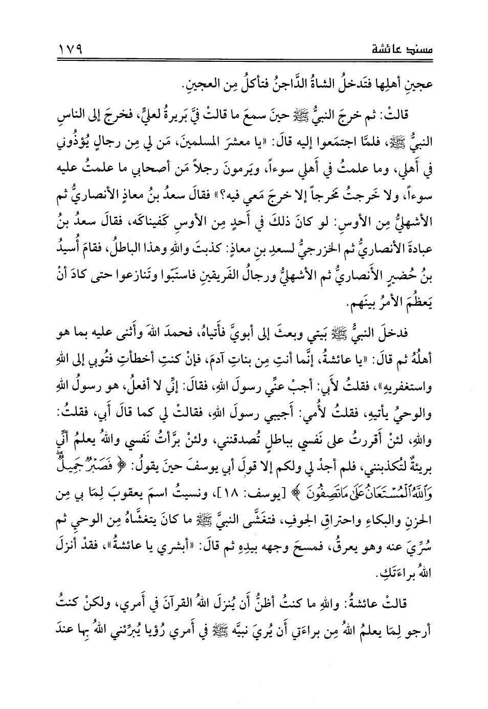 فدخلَ النبيُّ صلى الله عليه وسلم بَيتي وبعثَ إلى أبويَّ فأَتياهُ، فحمدَ اللهَ وأَثنى عليه بما هو أهلُهُ ثم قالَ: «يا عائشةُ، إنَّما أنتِ مِن بناتِ آدمَ، فإنْ كنتِ أخطأتِ فتُوبي إلى اللهِ واستغفريهِ»، فقلتُ لأَبي: أجبْ عنِّي رسولَ اللهِ، فقالَ: إنِّي لا أفعلُ، هو رسولُ اللهِ والوحيُ يأتيهِ، فقلتُ لأُمي: أَجيبي رسولَ اللهِ، فقالتْ لي كما قالَ أَبي، فقلتُ: واللهِ، لئنْ أَقررتُ على نَفسي بباطلٍ تُصدقنني، ولئنْ برَّأتُ نَفسي واللهُ يعلمُ أنِّي بريئةٌ لتُكذبنني، فلم أجدْ لي ولكم إلا قولَ أبي يوسفَ حينَ يقولُ: {فَصَبْرٌ جَمِيلٌ وَاللَّهُ الْمُسْتَعَانُ عَلَى مَا تَصِفُونَ} [يوسف: 18]، ونسيتُ اسمَ يعقوبَ لِمَا بي مِن الحزنِ والبكاءِ واحتراقِ الجوفِ، فتغَشَّى النبيَّ صلى الله عليه وسلم ما كانَ يتغشَّاهُ مِن الوحيِ ثم سُرِّيَ عنه وهو يعرقُ، فمسحَ وجهه بيدِهِ ثم قالَ: «أبشري يا عائشةُ»، فقدْ أنزلَ اللهُ براءَتَكِ.