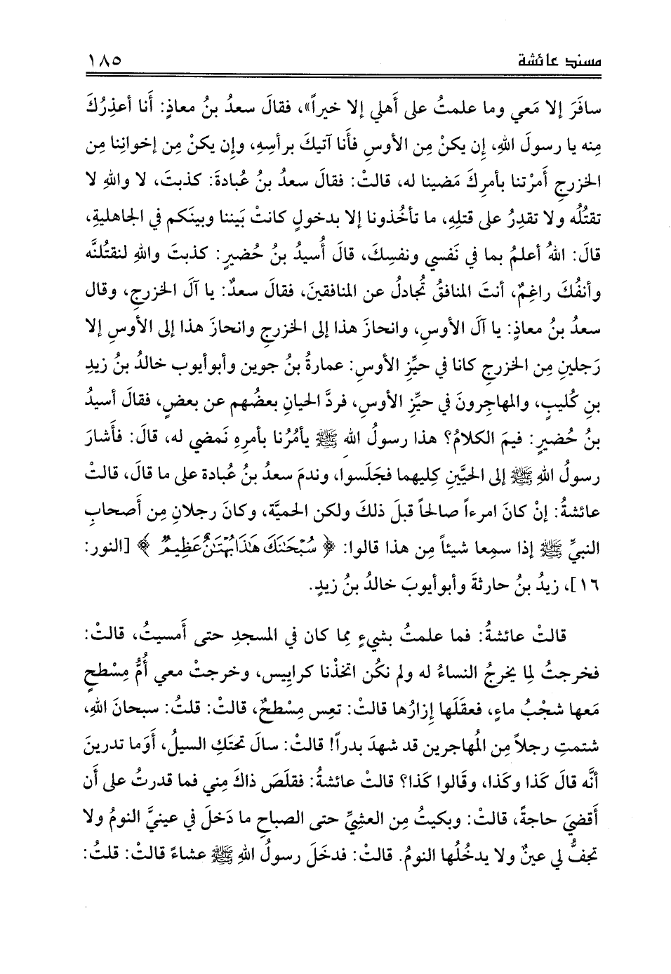 سافَرَ إلا مَعي وما علمتُ على أَهلي إلا خيراً»، فقالَ سعدُ بنُ معاذٍ: أَنا أعذِرُكَ مِنه يا رسولَ اللهِ، إِن يكنْ مِن الأوسِ فأَنا آتيكَ برأسِهِ، وإِن يكنْ مِن إخوانِنا مِن الخزرجِ أَمرْتنا بأمرِكَ مَضينا له، قالتْ: فقالَ سعدُ بنُ عُبادةَ: كذبتَ، لا واللهِ لا تقتُلُه ولا تقدِرُ على قتلِهِ، ما تأخُذونا إلا بدخولٍ كانتْ بَيننا وبينَكم في الجاهليةِ، قالَ: اللهُ أعلمُ بما في نَفسي ونفسِكَ، قالَ أُسيدُ بنُ حُضيرٍ: كذبتَ واللهِ لنقتُلنَّه وأنفُكَ راغِمٌ، أنتَ المنافقُ تُجادلُ عن المنافقينَ، فقالَ سعدٌ: يا آلَ الخزرجِ، وقال سعدُ بنُ معاذٍ: يا آلَ الأوسِ، وانحازَ هذا إلى الخزرجِ وانحازَ هذا إلى الأوسِ إلا رَجلينِ مِن الخزرجِ كانا في حيِّزِ الأوسِ: عمارةُ بنُ جوين وأبوأيوب خالدُ بنُ زيدِ بنِ كُليبٍ، والمهاجِرونَ في حيِّزِ الأوسِ، فردَّ الحيانِ بعضُهم عن بعضٍ، فقالَ أسيدُ بنُ حُضيرٍ: فيمَ الكلامُ؟ هذا رسولُ اللِه صلى الله عليه وسلم يأمُرُنا بأمرِهِ نَمضي له، قالَ: فأَشارَ رسولُ اللهِ صلى الله عليه وسلم إلى الحيَّينِ كِليهما فجَلَسوا، وندمَ سعدُ بنُ عُبادة على ما قالَ، قالتْ عائشةُ: إنْ كانَ امرءاً صالحاً قبلَ ذلكَ ولكن الحميَّة، وكانَ رجلانِ مِن أَصحابِ النبيِّ صلى الله عليه وسلم إذا سمِعا شيئاً مِن هذا قالوا: {سُبْحَانَكَ هَذَا بُهْتَانٌ عَظِيمٌ} [النور: 16]، زيدُ بنُ حارثة وأبوأيوبَ خالدُ بنُ زيدٍ.