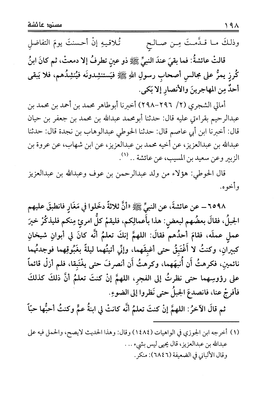 أمالي الشجري (2/ 296 - 298) أخبرنا أبوطاهر محمد بن أحمد بن محمد بن عبدالرحيم بقراءتي عليه قال: حدثنا أبومحمد عبدالله بن محمد بن جعفر بن حيان قال: أخبرنا ابن أبي عاصم قال: حدثنا الحوطي عبدالوهاب بن نجدة قال: حدثنا عبدالله بن عبدالعزيز، عن أخيه محمد بن عبدالعزيز، عن ابن شهاب، عن عروة بن الزبير وعن سعيد بن المسيب، عن عائشة .. (¬1).