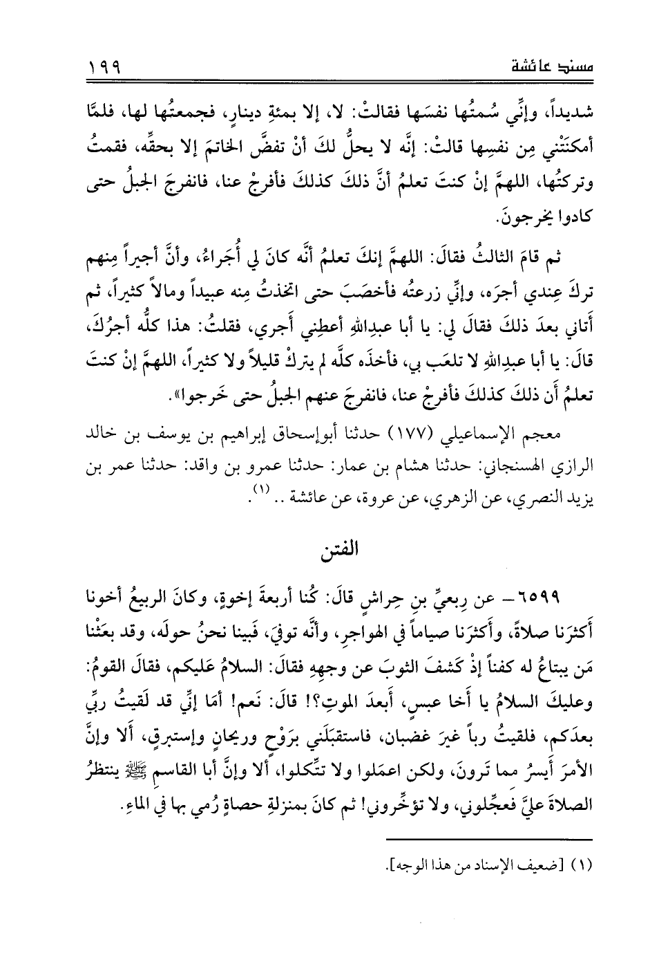 معجم الإسماعيلي (177) حدثنا أبوإسحاق إبراهيم بن يوسف بن خالد الرازي الهسنجاني: حدثنا هشام بن عمار: حدثنا عمرو بن واقد: حدثنا عمر بن يزيد النصري، عن الزهري، عن عروة، عن عائشة .. (¬1).