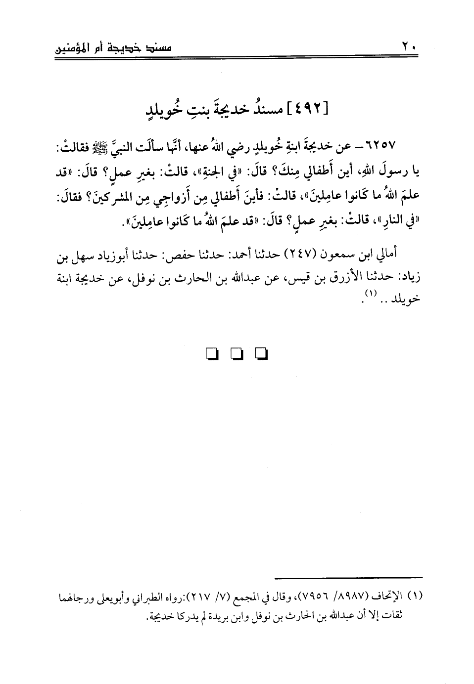 (¬1) الإتحاف (8987/ 7956)، وقال في المجمع (7/ 217):رواه الطبراني وأبويعلى ورجالهما ثقات إلا أن عبدالله بن الحارث بن نوفل وابن بريدة لم يدركا خديجة.