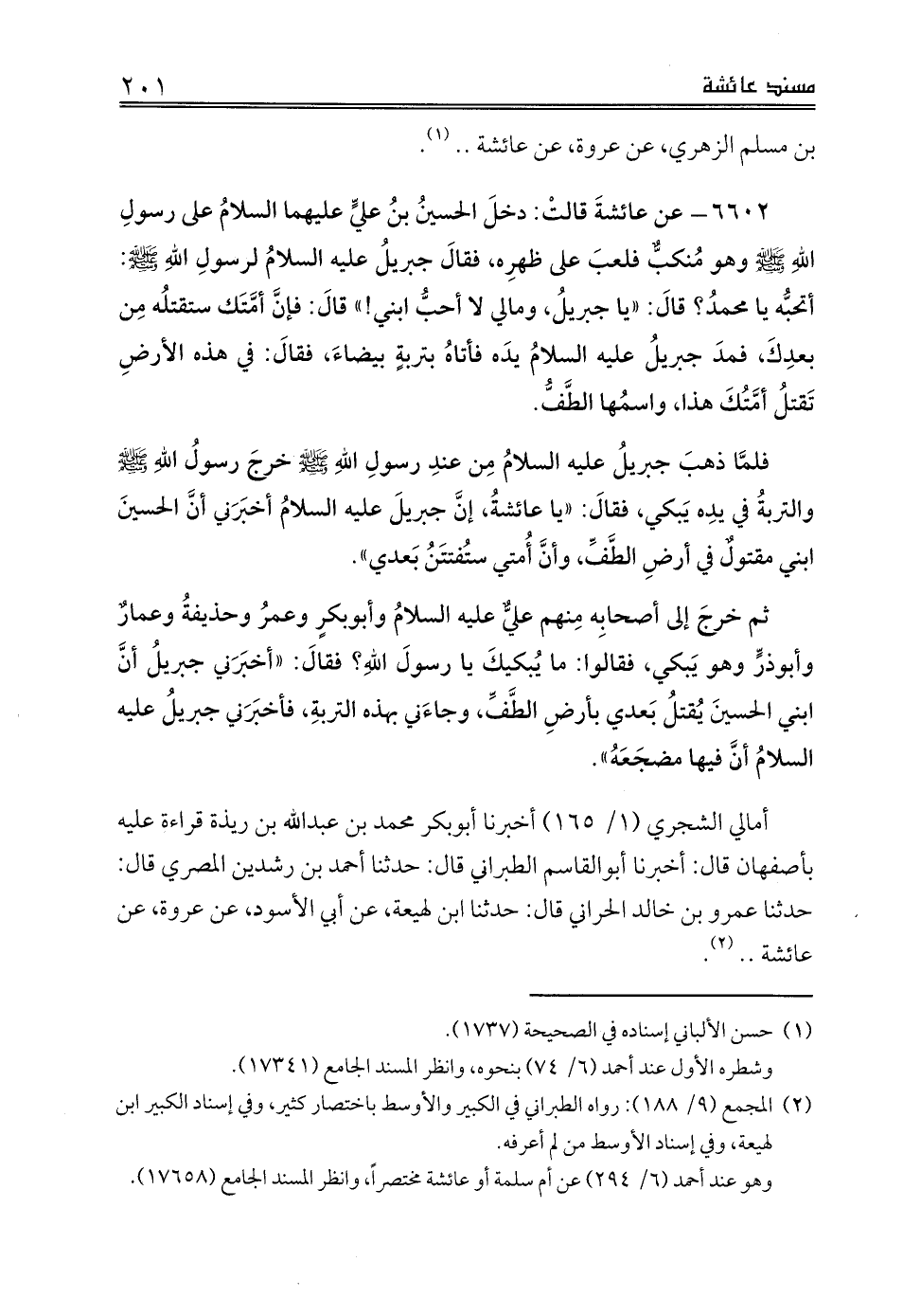 6602 - عن عائشةَ قالتْ: دخلَ الحسينُ بنُ عليٍّ عليهما السلامُ على رسولِ اللهِ صلى الله عليه وسلم وهو مُنكبٌّ فلعبَ على ظهرِه، فقالَ جبريلُ عليه السلامُ لرسولِ اللهِ صلى الله عليه وسلم: أتحبُّه يا محمدُ؟ قالَ: «يا جبريلُ، ومالي لا أحبُّ ابني!» قالَ: فإنَّ أمَّتَك ستقتلُه مِن بعدِكَ، فمدَ جبريلُ عليه السلامُ يدَه فأتاهُ بتربةٍ بيضاءَ، فقالَ: في هذه الأرضِ تَقتلُ أمَّتُكَ هذا، واسمُها الطَّفُّ.