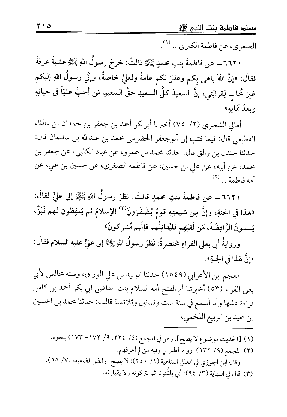 أمالي الشجري (2/ 75) أخبرنا أبوبكر أحمد بن جعفر بن حمدان بن مالك القطيعي قال: فيما كتب إلي أبوجعفر الحضرمي محمد بن عبدالله بن سليمان قال: حدثنا جندل بن والق قال: حدثنا محمد بن عمرو، عن عباد الكلبي، عن جعفر بن محمد، عن أبيه، عن علي بن حسين، عن فاطمة الصغرى، عن حسين بن علي، عن أمه فاطمة .. (¬2).