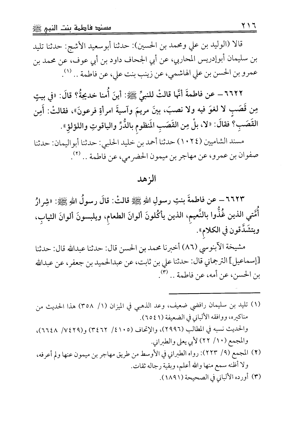 قالا (الوليد بن علي ومحمد بن الحسين): حدثنا أبوسعيد الأشج: حدثنا تليد بن سليمان أبوإدريس المحاربي، عن أبي الجحاف داود بن أبي عوف، عن محمد بن عمرو بن الحسن بن علي الهاشمي، عن زينب بنت علي، عن فاطمة .. (¬1).