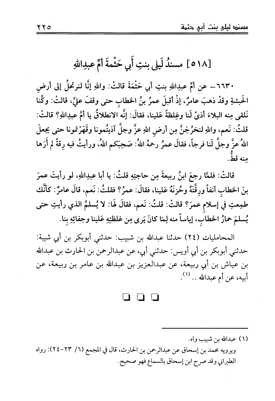 المحامليات (24) حدثنا عبدالله بن شبيب: حدثني أبوبكر بن أبي شيبة: حدثني أبوبكر ابن أبي أويس: حدثني أبي، عن عبدالرحمن بن الحارث بن عبدالله بن عياش بن أبي ربيعة، عن عبدالعزيز بن عبدالله بن عامر بن ربيعة، عن أبيه، عن أم عبدالله .. (¬1).