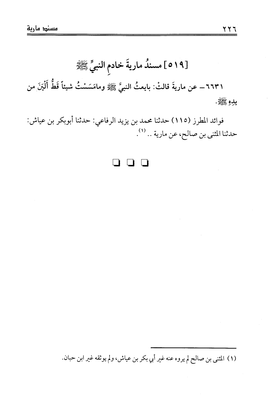 فوائد المطرز (115) حدثنا محمد بن يزيد الرفاعي: حدثنا أبوبكر بن عياش: حدثنا المثنى بن صالح، عن مارية .. (¬1).