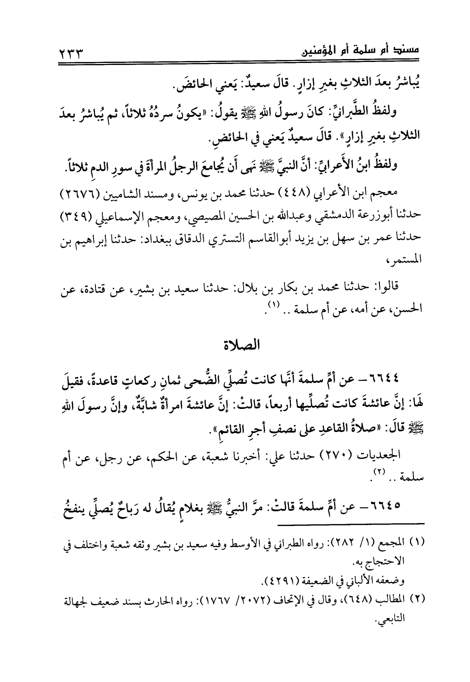 ولفظُ الطَّبرانيِّ: كانَ رسولُ اللهِ صلى الله عليه وسلم يقولُ: «يكونُ سردُهُ ثلاثاً، ثم يُباشرُ بعدَ الثلاثِ بغيرِ إزارٍ». قالَ سعيدٌ يَعني في الحائضِ.