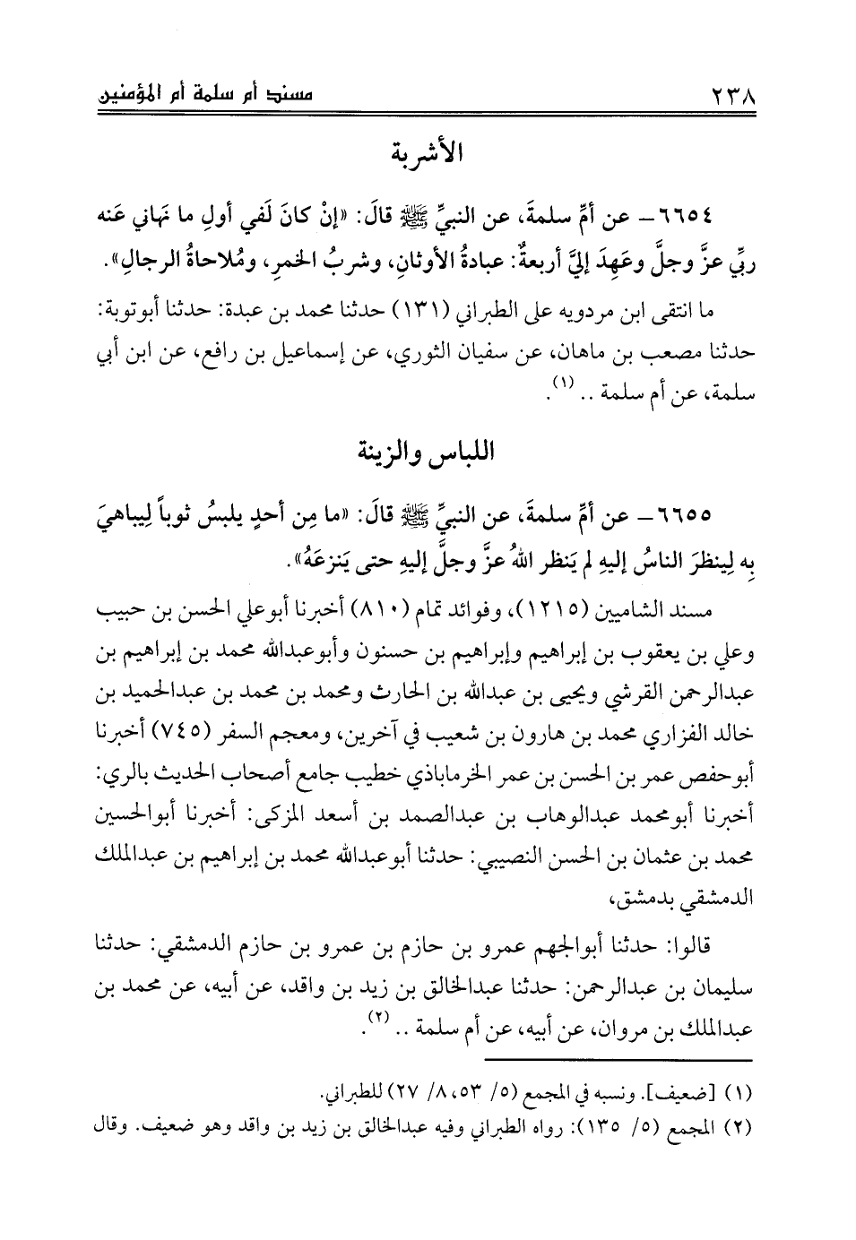 قالوا: حدثنا أبوالجهم عمرو بن حازم بن عمرو بن حازم الدمشقي: حدثنا سليمان بن عبدالرحمن: حدثنا عبدالخالق بن زيد بن واقد، عن أبيه، عن محمد بن عبدالملك بن مروان، عن أبيه، عن أم سلمة .. (¬2).