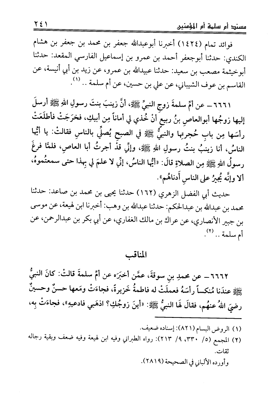 فوائد تمام (1424) أخبرنا أبوعبدالله جعفر بن محمد بن جعفر بن هشام الكندي: حدثنا أبوجعفر أحمد بن عمرو بن إسماعيل الفارسي المقعد: حدثنا أبوخيثمة مصعب بن سعيد: حدثنا عبيدالله بن عمرو، عن زيد بن أبي أنيسة، عن القاسم بن عوف الشيباني، عن علي بن حسين، عن أم سلمة .. (¬1).