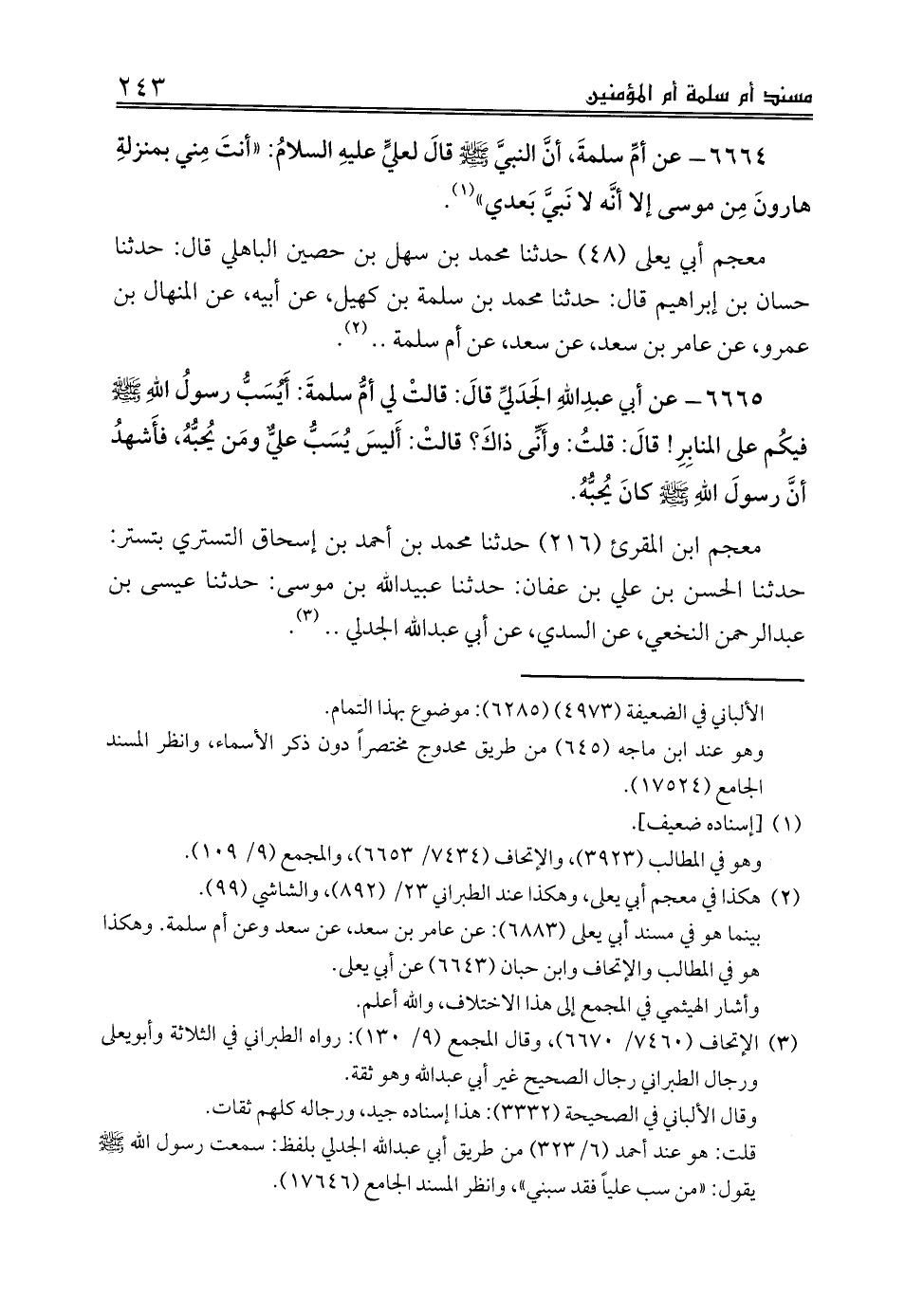 6665 - عن أبي عبدِاللهِ الجَدَليِّ قالَ: قالتْ لي أمُّ سلمةَ: أَيُسَبُّ رسولُ اللهِ صلى الله عليه وسلم فيكُم على المنابِرِ! قالَ: قلتُ: وأَنِّى ذاكَ؟ قالتْ: أَليسَ يُسَبُّ عليٌّ ومَن يُحبُّهُ، فأَشهدُ أنَّ رسولَ اللهِ صلى الله عليه وسلم كانَ يُحبُّهُ.