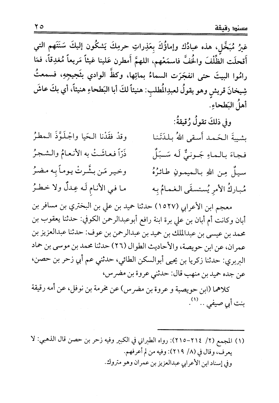 كلاهما (ابن حويصبة و عروة بن مضرس) عن مخرمة بن نوفل، عن أمه رقيقة بنت أبي صيفي .. (¬1).