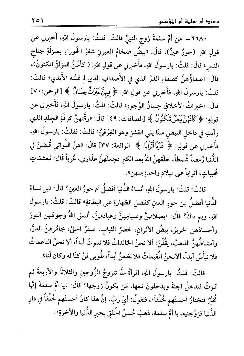 6680 - عن أمِّ سلمةَ زوجِ النبيِّ قالتْ: قلتُ: يارسولَ اللهِ، أَخبرني عن قولِ اللهِ: (حورٌ عينٌ)، قالَ: «بيضٌ ضخامُ العيونِ شفرُ الحَوراءِ بمنزلَةِ جناحِ النسرِ» قالَ: قلتُ: يارسولَ اللهِ، فأَخبرني عن قولِ اللهِ: (كأنَّهنَّ اللؤلؤُ المكنونُ)، قالَ: «صفاؤُهنَّ كصفاءِ الدرِّ الذي في الأَصدافِ الذي لم تمسَّه الأَيدي» قالتْ: قلتُ: يارسولَ اللهِ، فأَخبرني عن قولِ اللهِ: {فِيهِنَّ خَيْرَاتٌ حِسَانٌ} [الرحمن:70] قالَ: «خيراتُ الأخلاقِ حِسانُ الوُجوهِ» قالتْ: قلتُ: يارسولَ اللهِ، فأَخبرني عن قولِهِ: {كَأَنَّهُنَّ بَيْضٌ مَكْنُونٌ} [الصافات: 49] قالَ: «رقَّتهنَّ كرقَّةِ الجِلدِ الذي رأيتِ في داخلِ البيضِ ممَّا يلي القشرَ وهو الغِرْقئُ» قالتْ: فقلتُ: يارسولَ اللهِ، فأَخبرني عن قولِهِ: {عُرُبًا أَتْرَابًا} [الواقعة: 37] قالَ: «هنَّ اللَّواتي قُبضنَ في الدُّنيا رُمصاً شُمطاً، خلَقهنَّ اللهُ بعد الكبرِ فجعلَهنَّ عذَارى، عُرباً قَال: مُعشقاتٍ مُحبباتٍ، أتراباً على ميلادِ واحدةٍ مِنهن».