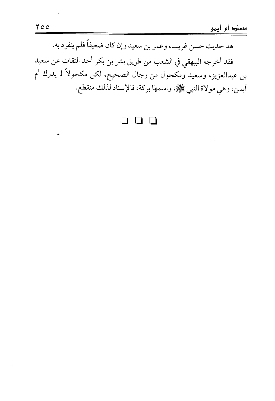 فقد أخرجه البيهقي في الشعب من طريق بشر بن بكر أحد الثقات عن سعيد بن عبدالعزيز، وسعيد ومكحول من رجال الصحيح، لكن مكحولاً لم يدرك أم أيمن، وهي مولاة النبي صلى الله عليه وسلم، واسمها بركة، فالإسناد لذلك منقطع.