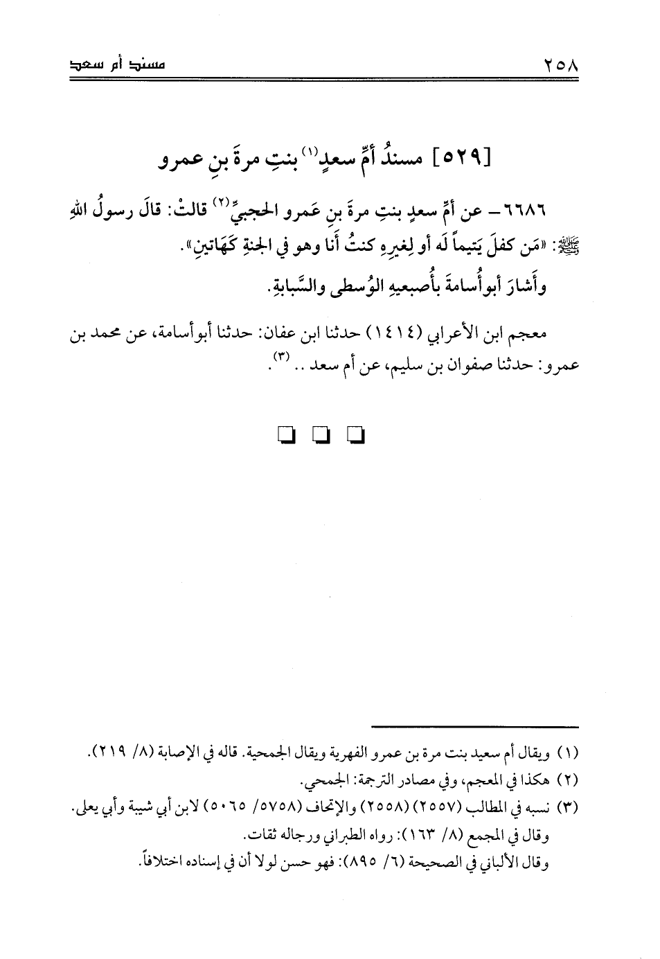 6686 - عن أمِّ سعدٍ بنتِ مرةَ بنِ عَمرو الحجبيِّ (¬2) قالتْ: قالَ رسولُ اللهِ صلى الله عليه وسلم: «مَن كفلَ يَتيماً لَه أو لِغيرِهِ كنتُ أَنا وهو في الجنةِ كَهَاتينِ».