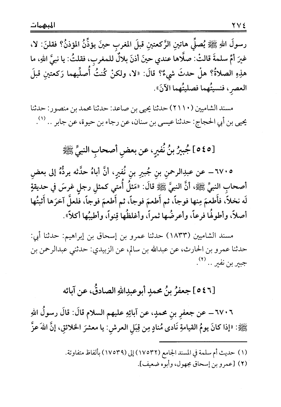 6705 - عن عبدِالرحمنِ بنِ جُبيرِ بنِ نُفيرٍ، أنَّ أباهُ حدَّثه يردُّهُ إلى بعضِ أصحابِ النبيِّ صلى الله عليه وسلم، أنَّ النبيَّ صلى الله عليه وسلم قالَ: «مَثلُ أُمتي كمثلِ رجلٍ غرسَ في حديقةٍ لَه نخلاً، فأَطعمَ مِنها فوجاً، ثم أَطعمَ فوجاً، ثم أَطعمَ فوجاً، فلعلَّ آخرَها أَثبتُها أصلاً، وأطولُها فرعاً، وأعرضُها ثمراً، وأغلظُها قِنواً، وأطيبُها أكلاً».