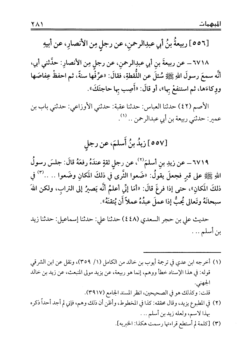 6719 - عن زيدِ بنِ أسلمَ (¬2)، عن رجلٍ ثقةٍ عندَهُ رفعَهُ قالَ: جلسَ رسولُ اللهِ صلى الله عليه وسلم على قبرٍ فجعلَ يقولُ: «ضَعوا الثَّرى في ذلكَ المَكانِ وضَعوا .. .. (¬3) في ذلكَ المَكانِ»، حتى إذا فرغَ قالَ: «أمَا إنِّي أعلمُ أنَّه يَصيرُ إلى الترابِ، ولكن اللهَ سبحانَهُ وتَعالى يُحبُّ إذا عملَ عبدُهُ عملاً أَن يُتقنَهُ».