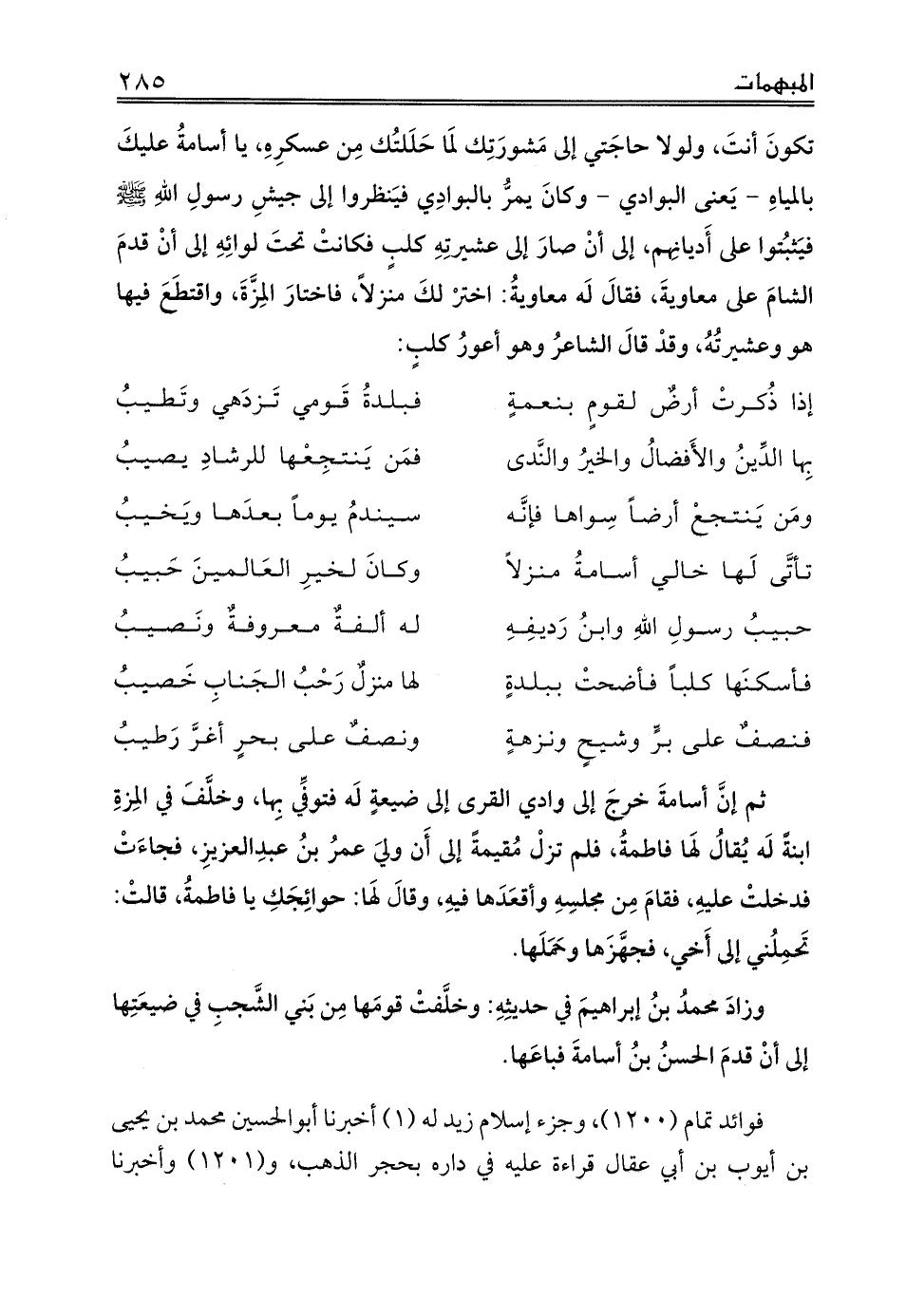 وزادَ محمدُ بنُ إبراهيمَ في حديثِهِ: وخلَّفتْ قومَها مِن بَني الشَّجبِ في ضيعَتِها إلى أنْ قدمَ الحسنُ بنُ أسامةَ فباعَها.
