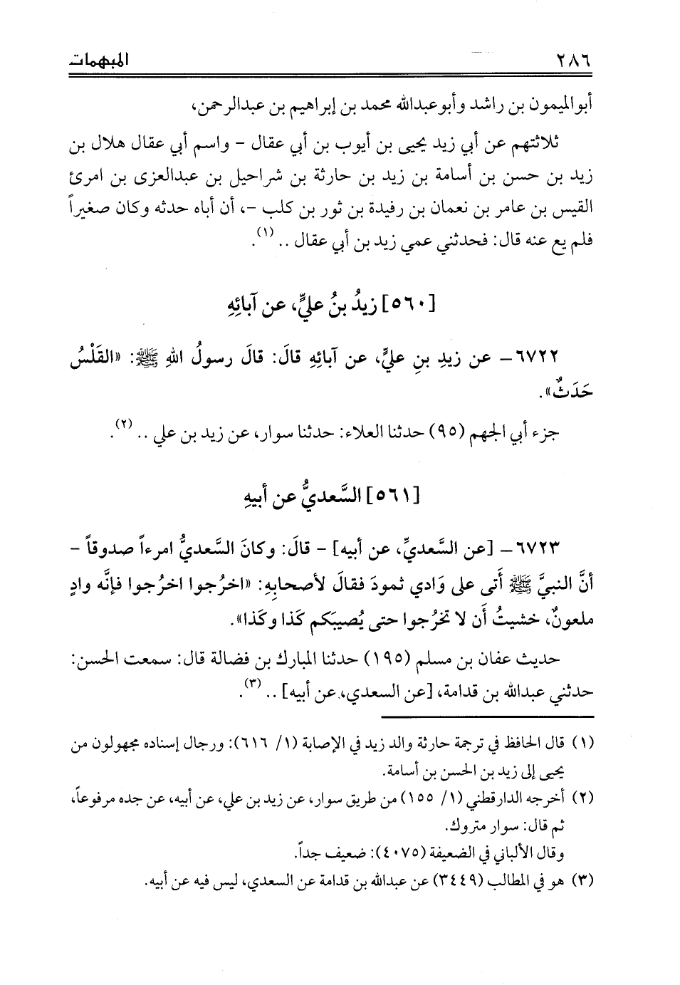 (¬1) قال الحافظ في ترجمة حارثة والد زيد في الإصابة (1/ 616): ورجال إسناده مجهولون من يحيى إلى زيد بن الحسن بن أسامة.