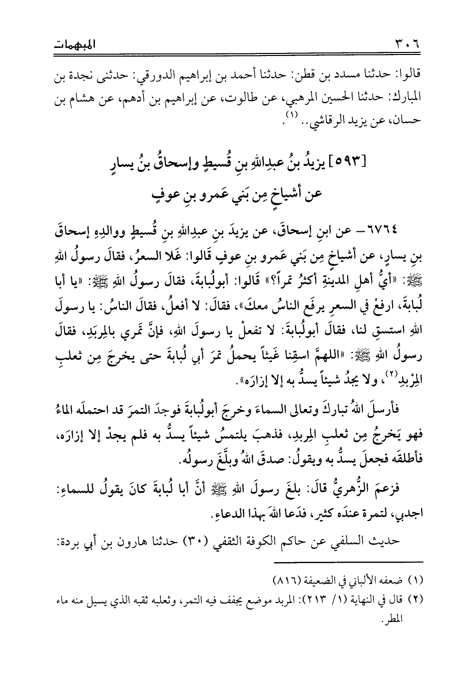 6764 - عن ابنِ إسحاقَ، عن يزيدَ بنِ عبدِاللهِ بنِ قُسيطٍ ووالدِهِ إسحاقَ بنِ يسارٍ، عن أشياخٍ مِن بَني عَمرو بنِ عوفٍ قَالوا: غَلا السعرُ، فقالَ رسولُ اللهِ صلى الله عليه وسلم: «أيُّ أهلِ المدينةِ أكثرُ تمراً؟» قَالوا: أبولُبابةَ، فقالَ رسولُ اللهِ صلى الله عليه وسلم: «يا أبا لُبابةَ، ارفعْ في السعرِ يرفَع الناسُ معكَ»، فقالَ: لا أفعلُ، فقالَ الناسُ: يا رسولَ اللهِ استسقِ لنا، فقالَ أبولُبابةَ: لا تفعلْ يا رسولَ اللهِ، فإنَّ تَمري بالِمربَدِ، فقالَ رسولُ اللهِ صلى الله عليه وسلم: «اللهمَّ اسقِنا غَيثاً يحملُ تمرَ أبي لُبابةَ حتى يخرجَ مِن ثعلبِ المِرْبدِ (¬2)، ولا يجدُ شيئاً يسدُّ به إلا إزارَه».