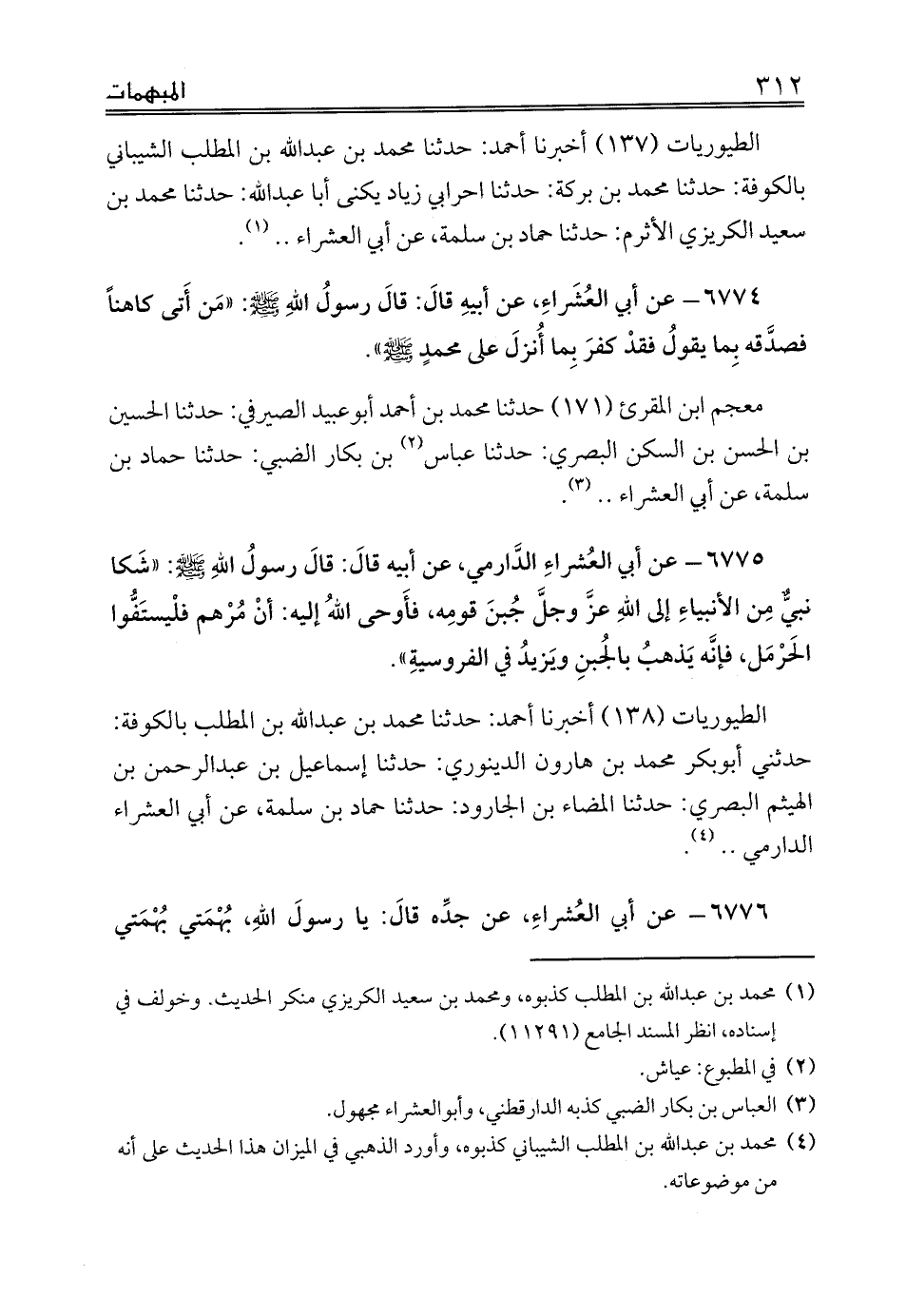 الطيوريات (138) أخبرنا أحمد: حدثنا محمد بن عبدالله بن المطلب بالكوفة: حدثني أبوبكر محمد بن هارون الدينوري: حدثنا إسماعيل بن عبدالرحمن بن الهيثم البصري: حدثنا المضاء بن الجارود: حدثنا حماد بن سلمة، عن أبي العشراء الدارمي .. (¬4).