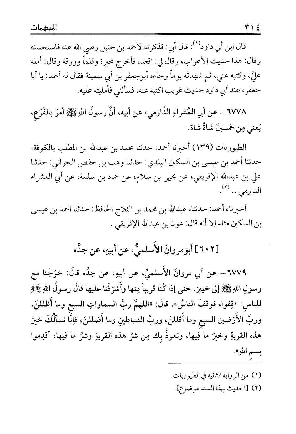 الطيوريات (139) أخبرنا أحمد: حدثنا محمد بن عبدالله بن المطلب بالكوفة: حدثنا أحمد بن عيسى بن السكين البلدي: حدثنا وهب بن حفص الحراني: حدثنا علي بن عبدالله الإفريقي، عن يحيى بن سلام، عن حماد بن سلمة، عن أبي العشراء الدارمي .. (¬2).