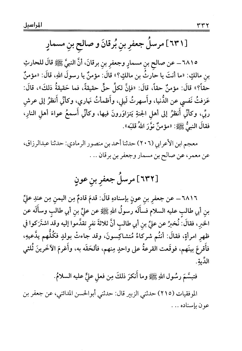 6815 - عن صالحِ بنِ مسمارٍ وجعفرِ بنِ برقانَ، أنَّ النبيَّ صلى الله عليه وسلم قالَ للحارثِ بنِ مالكٍ: «ما أنتَ يا حارثُ بن مالكٍ؟» قالَ: مؤمنٌ يا رسولَ اللهِ، قالَ: «مؤمنٌ حقاً؟» قالَ: مؤمنٌ حقاً، قالَ: «فإنَّ لكلِّ حقٍّ حقيقةً، فما حَقيقةُ ذلكَ»، قالَ: عَزفتُ نَفسي عن الدُّنيا، وأَسهرتُ لَيلي، وأَظمأتُ نَهاري، وكأنِّي أَنظرُ إلى عرشِ ربِّي، وكأنِّي أَنظرُ إلى أهلِ الجنةِ يَتزاوَرونَ فيها، وكأنِّي أَسمعُ عواءَ أهلِ النارِ، فقالَ النبيُّ صلى الله عليه وسلم: «مؤمنٌ نوَّرَ اللهُ قلبَه».