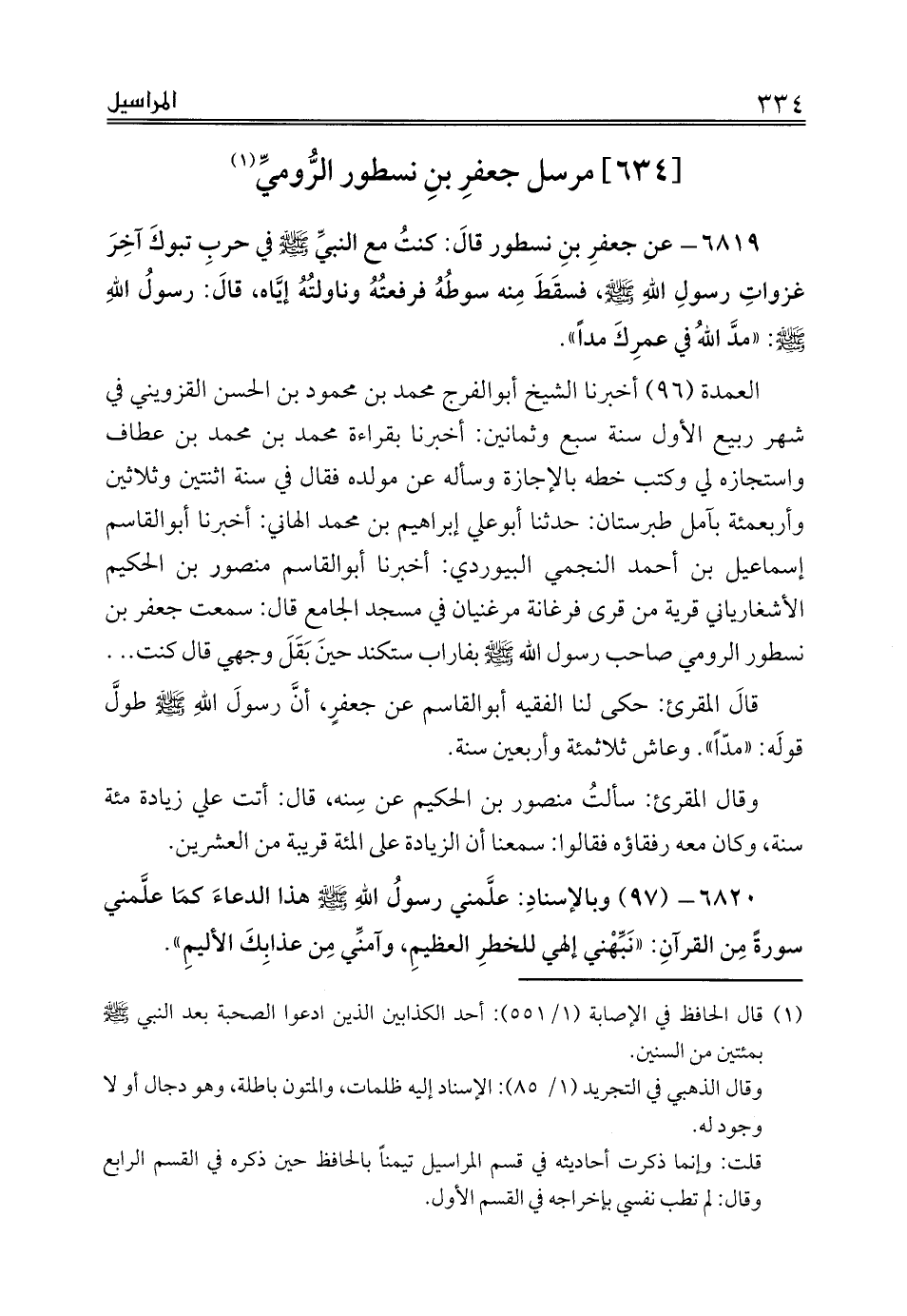 العمدة (96) أخبرنا الشيخ أبوالفرج محمد بن محمود بن الحسن القزويني في شهر ربيع الأول سنة سبع وثمانين: أخبرنا بقراءة محمد بن محمد بن عطاف واستجازه لي وكتب خطه بالإجازة وسأله عن مولده فقال في سنة اثنتين وثلاثين وأربعمئة بآمل طبرستان: حدثنا أبوعلي إبراهيم بن محمد الهاني: أخبرنا أبوالقاسم إسماعيل بن أحمد النجمي البيوردي: أخبرنا أبوالقاسم منصور بن الحكيم الأشغارياني قرية من قرى فرغانة مرغنيان في مسجد الجامع قال: سمعت جعفر بن نسطور الرومي صاحب رسول الله صلى الله عليه وسلم بفاراب ستكند حينَ بَقَلَ وجهي قال كنت .. .
