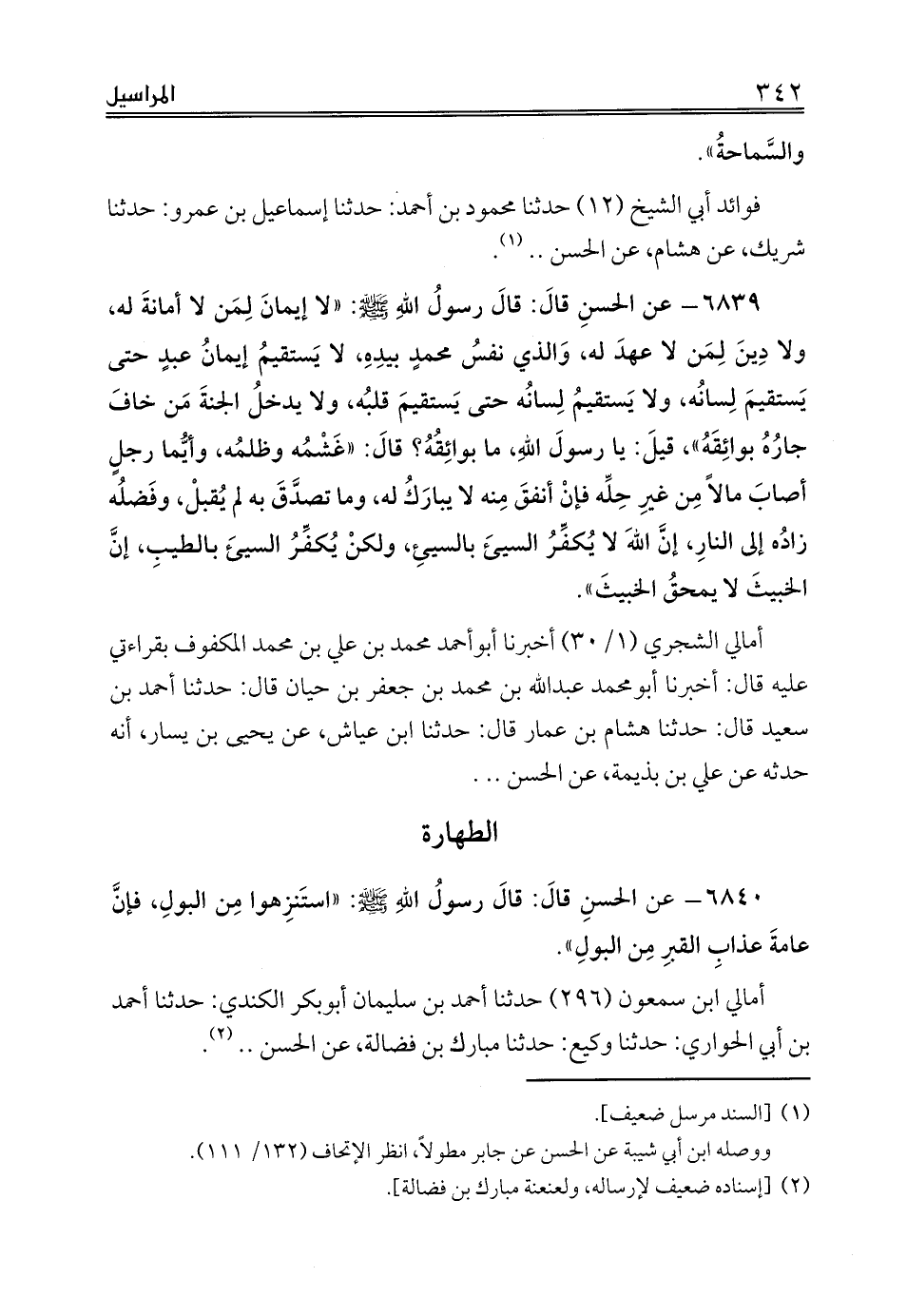 6839 - عن الحسنِ قالَ: قالَ رسولُ اللهِ صلى الله عليه وسلم: «لا إيمانَ لِمَن لا أمانةَ له، ولا دِينَ لِمَن لا عهدَ له، وَالذي نفسُ محمدٍ بيدِهِ، لا يَستقيمُ إيمانُ عبدٍ حتى يَستقيمَ لِسانُه، ولا يَستقيمُ لِسانُه حتى يَستقيمَ قلبُه، ولا يدخلُ الجنةَ مَن خافَ جارُهُ بوائِقَهُ»، قيلَ: يا رسولَ اللهِ، ما بوائِقُهُ؟ قالَ: «غَشْمُه وظلمُه، وأيُّما رجلٍ أصابَ مالاً مِن غيرِ حِلِّه فإنْ أنفقَ مِنه لا يبارَكُ له، وما تصدَّقَ به لم يُقبلْ، وفَضلُه زادُه إلى النارِ، إنَّ اللهَ لا يُكفِّرُ السيئَ بالسيئِ، ولكنْ يُكفِّرُ السيئَ بالطيبِ، إنَّ الخبيثَ لا يمحقُ الخبيثَ».