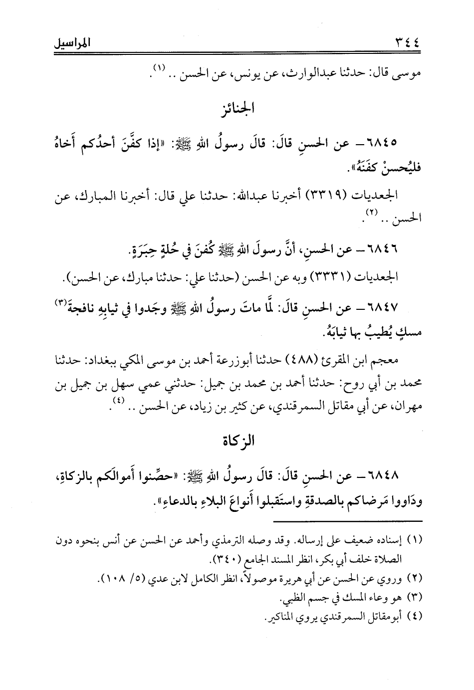 6847 - عن الحسنِ قالَ: لمَّا ماتَ رسولُ اللهِ صلى الله عليه وسلم وجَدوا في ثيابِهِ نافجةَ (¬3) مسكٍ يُطيبُ بها ثيابَهُ.