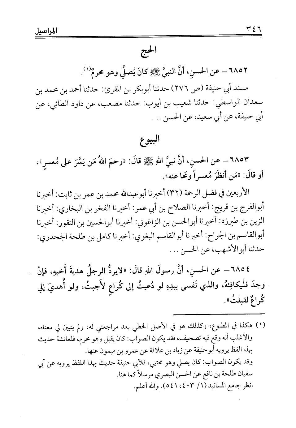 6852 - عن الحسنِ، أنَّ النبيَّ صلى الله عليه وسلم كانَ يُصلِّي وهو محرمٌ.