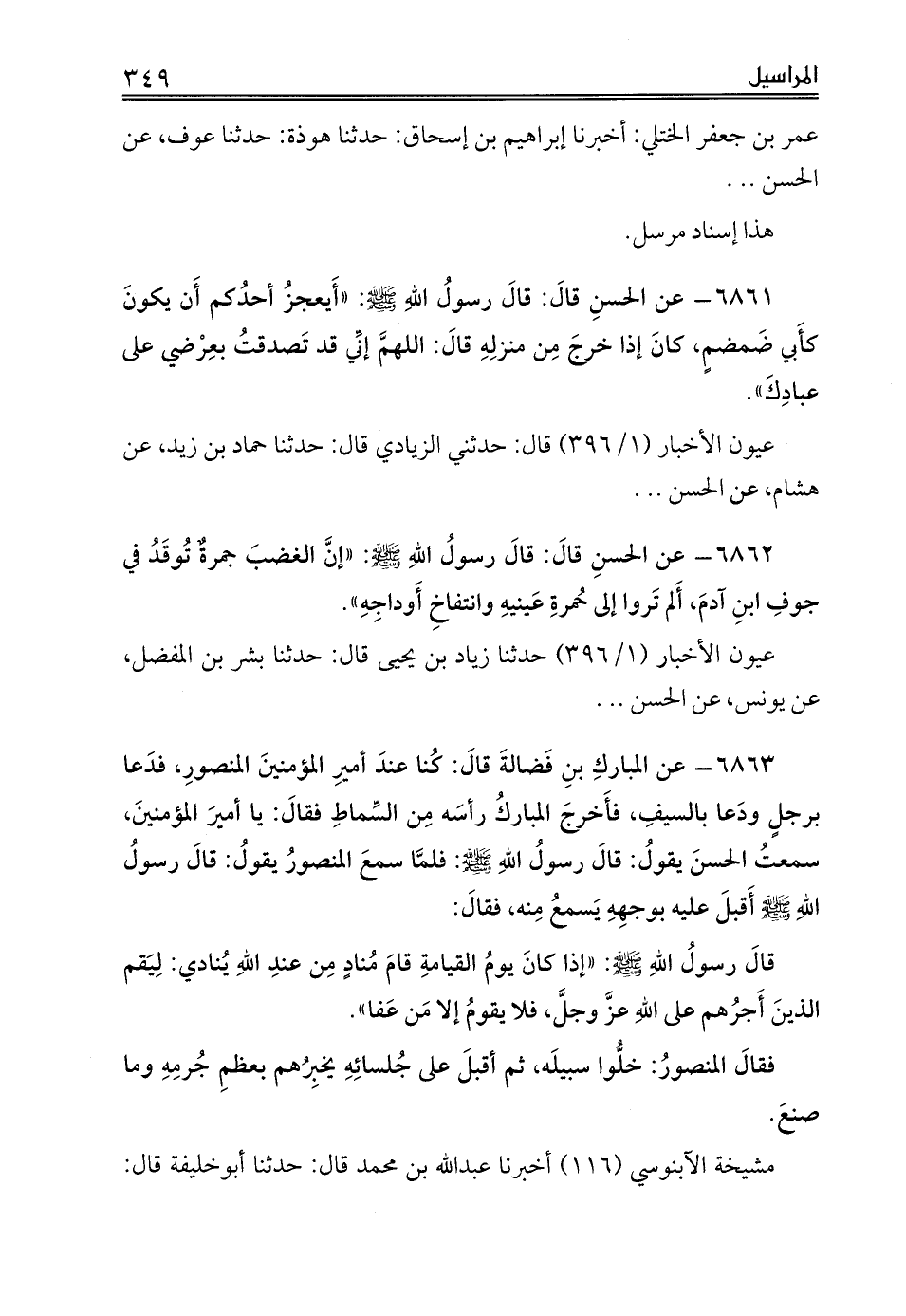 6863 - عن المباركِ بنِ فَضالةَ قالَ: كُنا عندَ أميرِ المؤمنينَ المنصورِ، فدَعا برجلٍ ودَعا بالسيفِ، فأَخرجَ المباركُ رأسَه مِن السِّماطِ فقالَ: يا أميرَ المؤمنينَ، سمعتُ الحسنَ يقولُ: قالَ رسولُ اللهِ صلى الله عليه وسلم: فلمَّا سمعَ المنصورُ يقولُ: قالَ رسولُ اللهِ صلى الله عليه وسلم أَقبلَ عليه بوجهِهِ يَسمعُ مِنه، فقالَ: