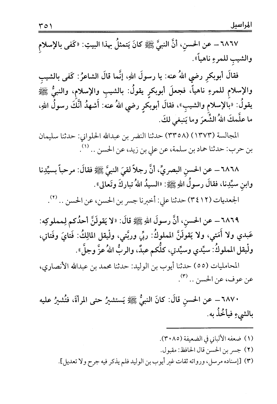 6868 - عن الحسنِ البصريِّ، أنَّ رجلاً لقيَ النبيَّ صلى الله عليه وسلم فقالَ: مرحباً بسيِّدِنا وابنِ سيِّدِنا، فقالَ رسولُ اللهِ صلى الله عليه وسلم: «السيدُ اللهُ تباركَ وتَعالى».
