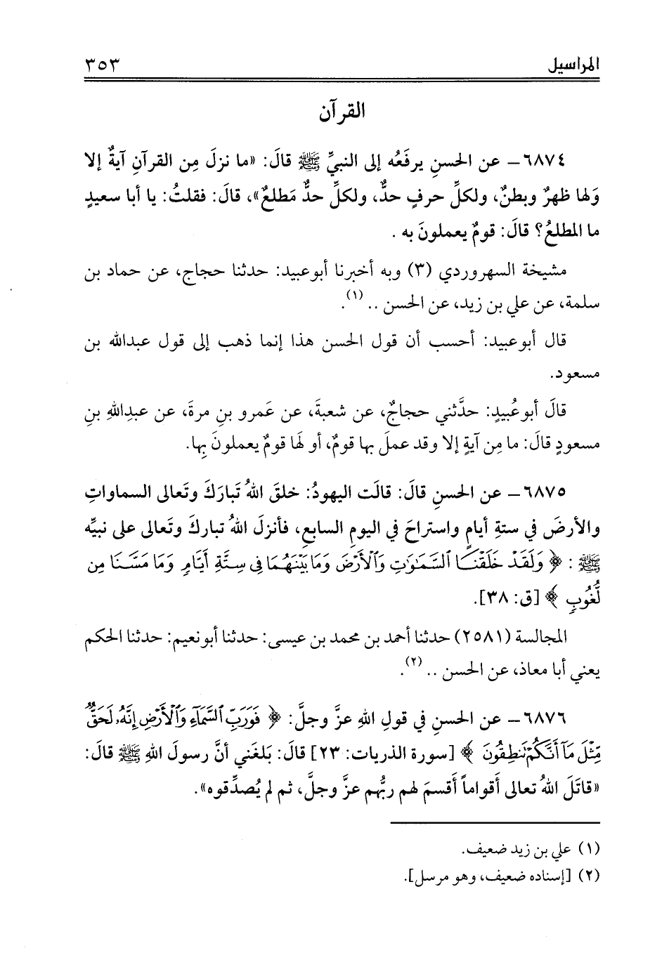 6876 - عن الحسنِ في قولِ اللهِ عزَّ وجلَّ: {فَوَرَبِّ السَّمَاءِ وَالْأَرْضِ إِنَّهُ لَحَقٌّ مِثْلَ مَا أَنَّكُمْ تَنْطِقُونَ} [سورة الذريات: 23] قالَ: بَلغَني أنَّ رسول الله صلى الله عليه وسلم قالَ: «قاتَلَ اللهُ تعالى أَقواماً أَقسمَ لهم ربُّهم عزَّ وجلَّ، ثم لم يُصدِّقوه».