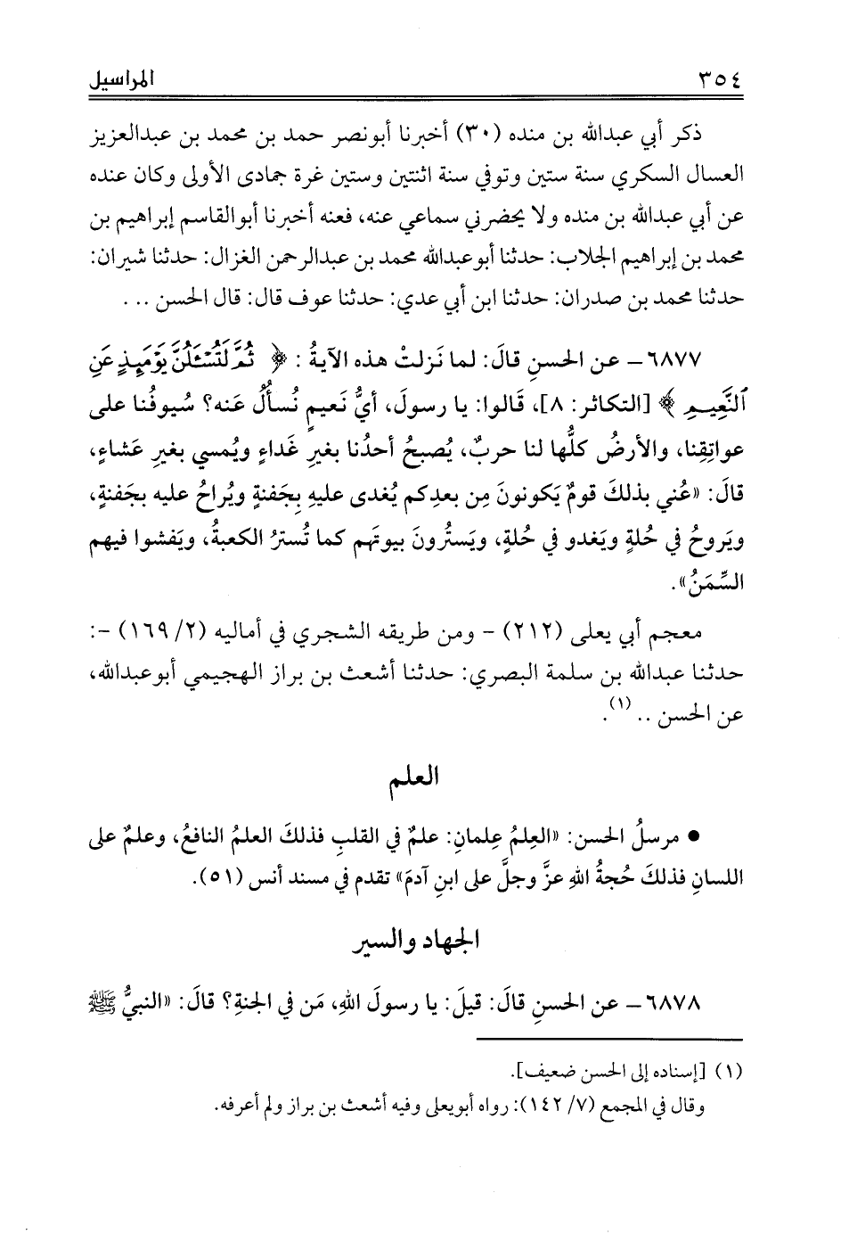* مرسلُ الحسن: «العِلمُ عِلمانِ: علمٌ في القلبِ فذلكَ العلمُ النافعُ، وعلمٌ على اللسانِ فذلكَ حُجةُ اللهِ عزَّ وجلَّ على ابنِ آدمَ» تقدم في مسند أنس (51).