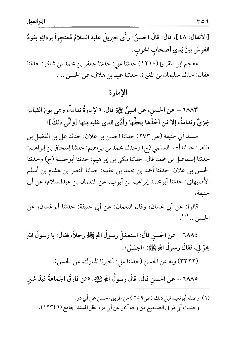 6885 - عن الحسنِ قالَ: قالَ رسولُ اللهِ صلى الله عليه وسلم: «مَن فارقَ الجماعةَ قيدَ شبرٍ