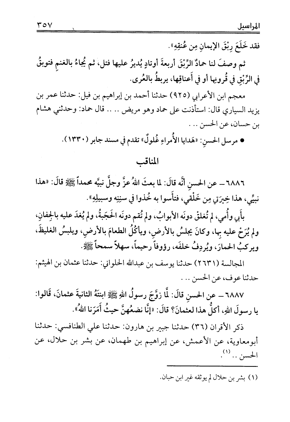 ذكر الأقران (36) حدثنا جبير بن هارون: حدثنا علي الطنافسي: حدثنا أبومعاوية، عن الأعمش، عن إبراهيم بن طهمان، عن بشر بن حلال، عن الحسن .. (¬1).
