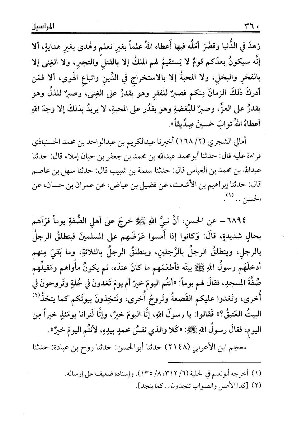 6894 - عن الحسنِ، أنَّ نبيَّ اللهِ صلى الله عليه وسلم خرجَ على أهلِ الصُّفةِ يوماً فرَآهم بحالٍ شديدةٍ، قالَ: وَكانوا إذا أَمسوا عَرَضَهم على المسلمينَ فينطلقُ الرجلُ بالرجلِ، وينطلقُ الرجلُ بالرَّجلينِ، وينطلقُ الرجلُ بالثلاثةِ، وما بَقيَ مِنهم أدخلَهَم رسولُ اللهِ صلى الله عليه وسلم بيتَه فأطعَمَهم ما كانَ عندَه، ثم يكونُ مأْواهم ومَقيلُهم صُفَّةَ المسجدِ، فقالَ لهم يوماً: «أنتُم اليومَ خيرٌ أم يومَ تَغدونَ في حُلةٍ وتَروحونَ في أُخرى، وتَغدوا عليكم القَصعةُ وتَروحُ أُخرى، وتَتخِذونَ بيوتَكم كما يتخذُ (¬2) البيتُ العَتيقُ؟» فَقالوا: يا رسولَ اللهِ، إنَّا اليومَ خيرٌ، وإنَّا لَنرانا يومَئذٍ خيراً مِن اليومِ، فقالَ رسولُ اللهِ صلى الله عليه وسلم: «كَلا والذي نفسُ محمدٍ بيدِهِ، لأنتُم اليومَ خيرٌ».